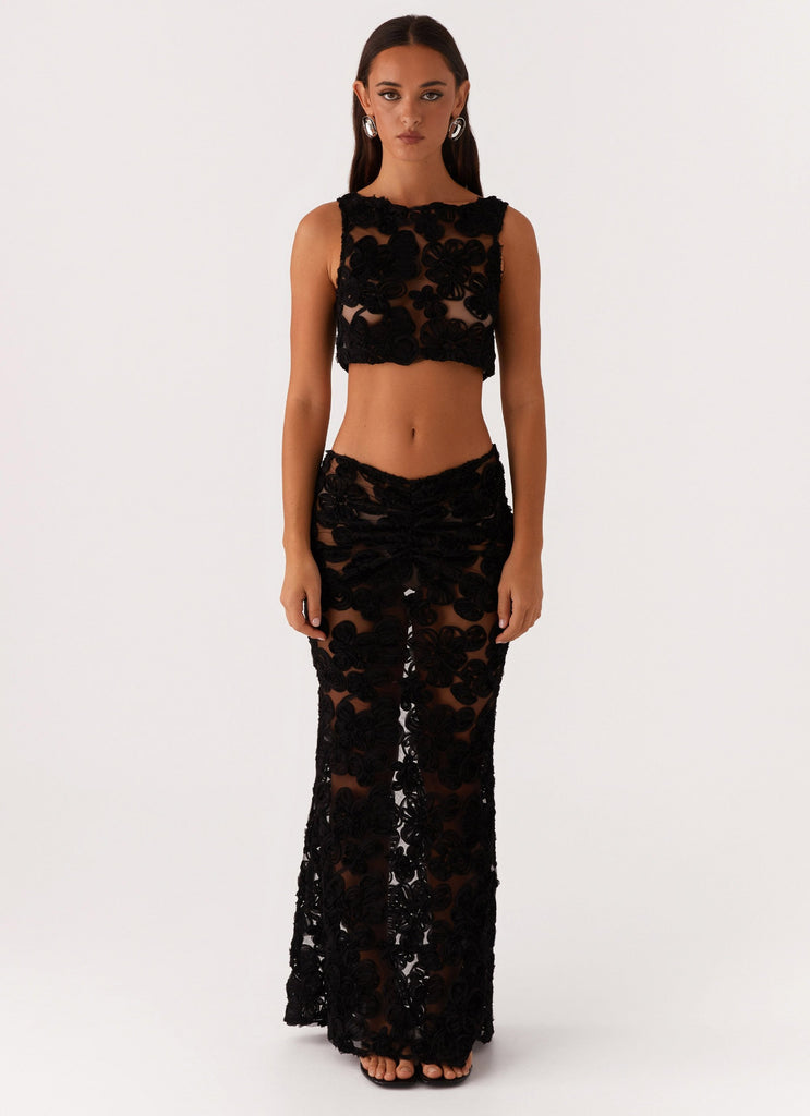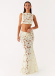This set is comfortable, made from soft, breathable lace. The cropped top and long skirt complement each other beautifully, creating a harmonious and elegant look.