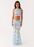 This two-piece set, featuring a floral lace pattern, exudes romantic, sophisticated charm. The sleeveless cropped top features a high neckline, while the matching long skirt is tailored for a slim fit and detailed with delicate twists at the waist, flattering the figure. The sheer lace fabric adds a touch of sophistication and allure.