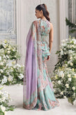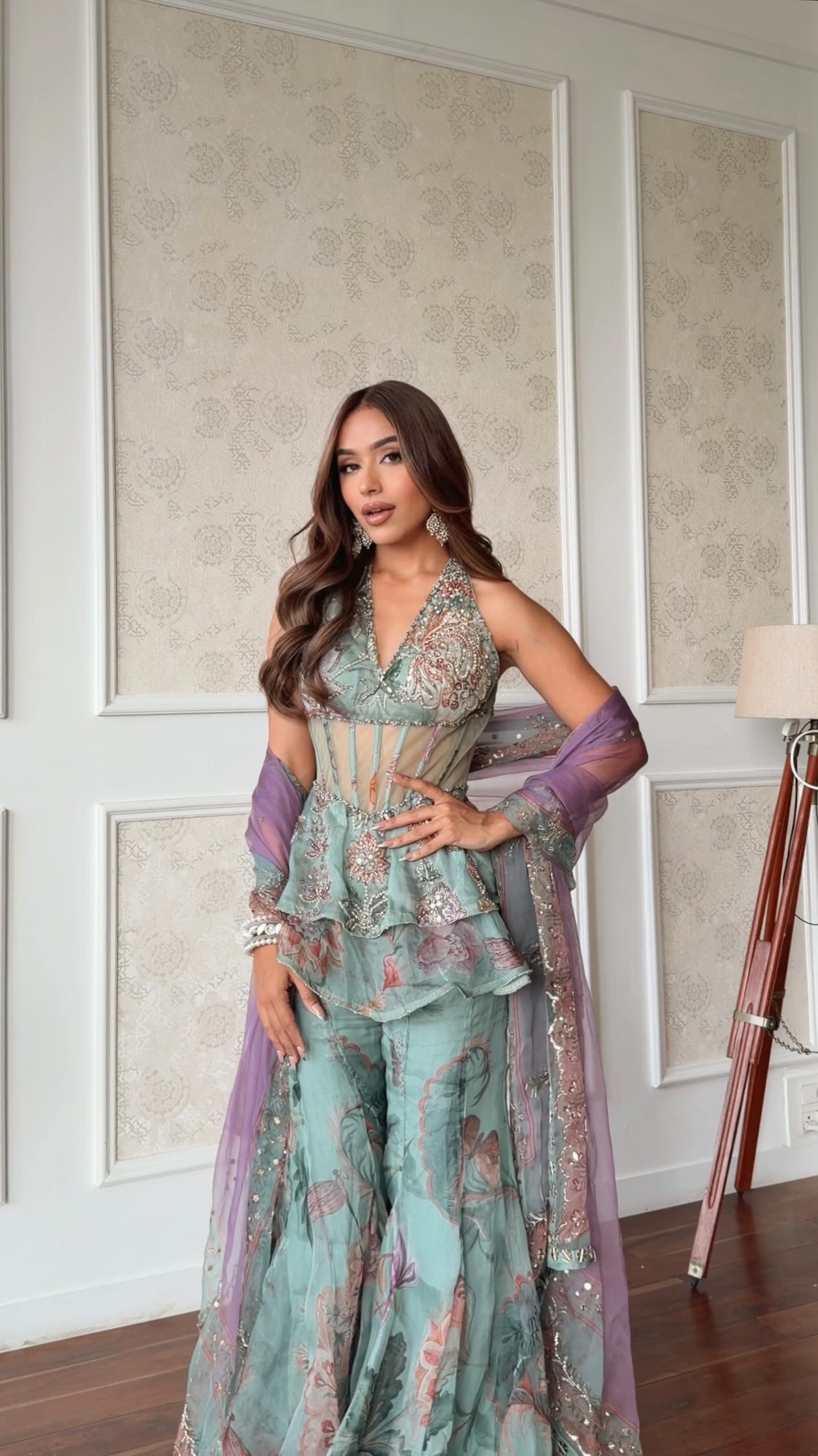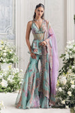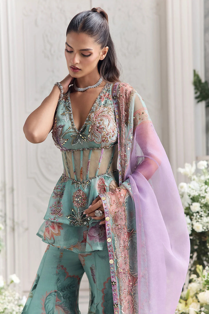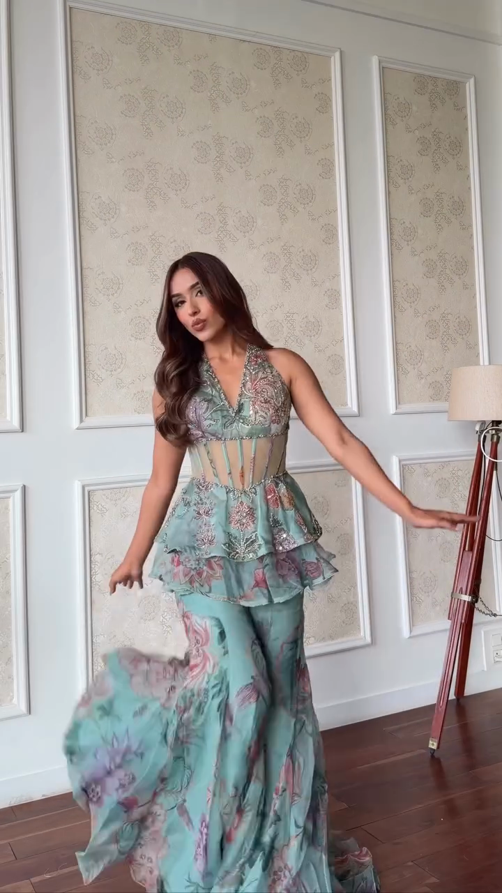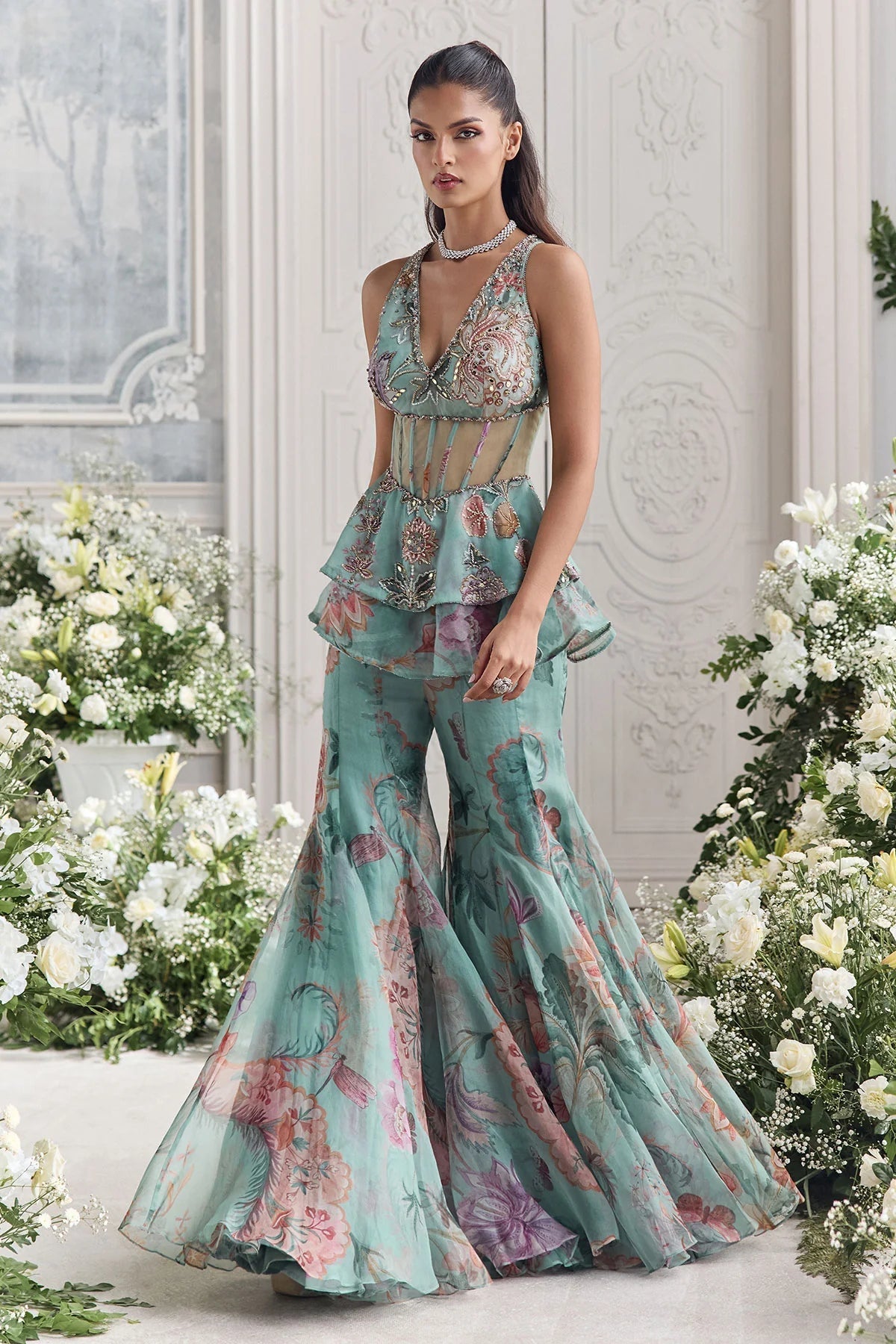 This two-piece set features a light turquoise base and vibrant floral print for a romantic and eye-catching look. The ruffled top features a deep V-neckline and delicately beaded details, while a sheer waistband adds an elegant touch. The matching flared pants create an elegant, flowing silhouette, adding a touch of femininity.