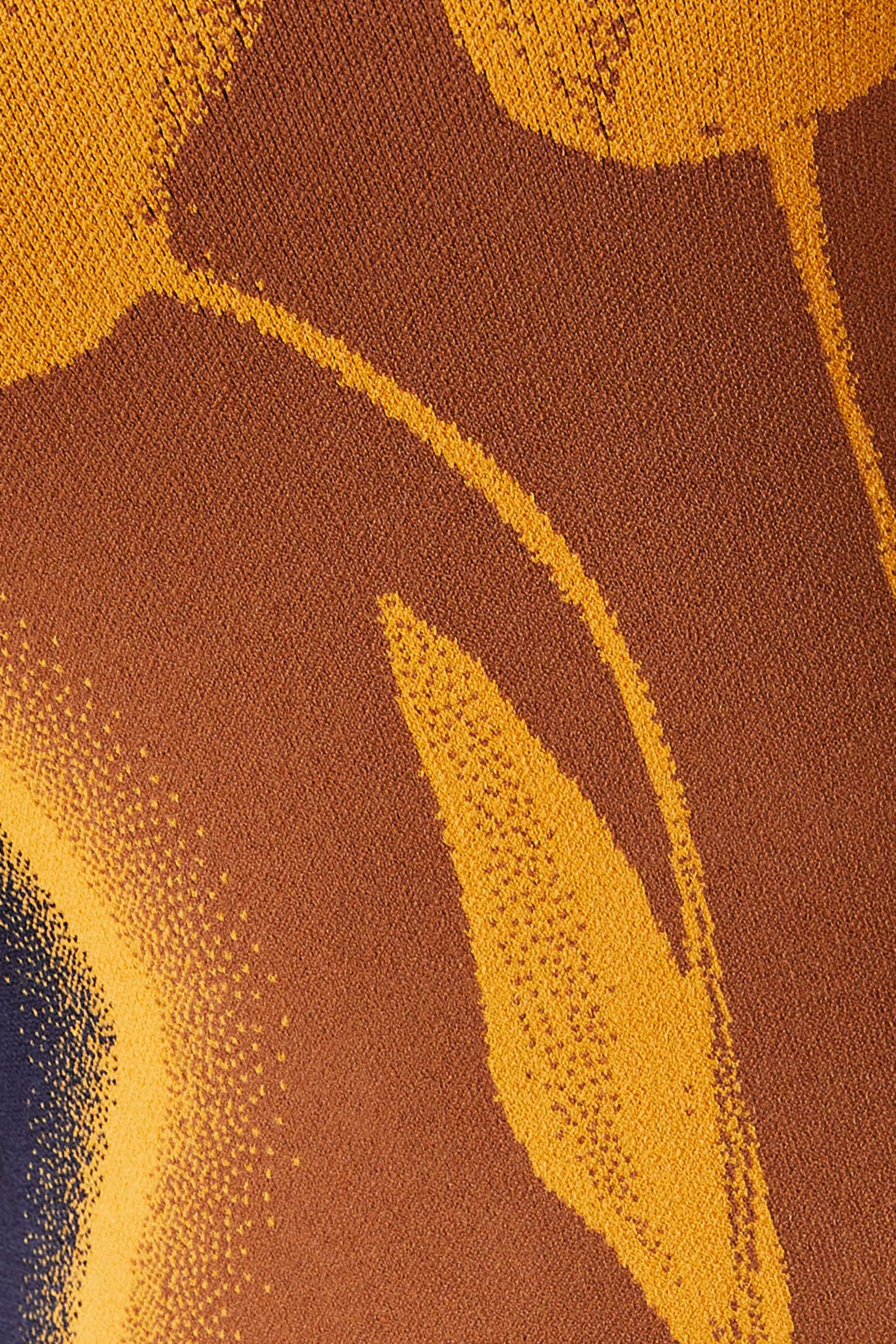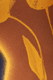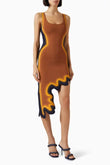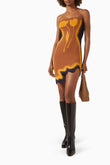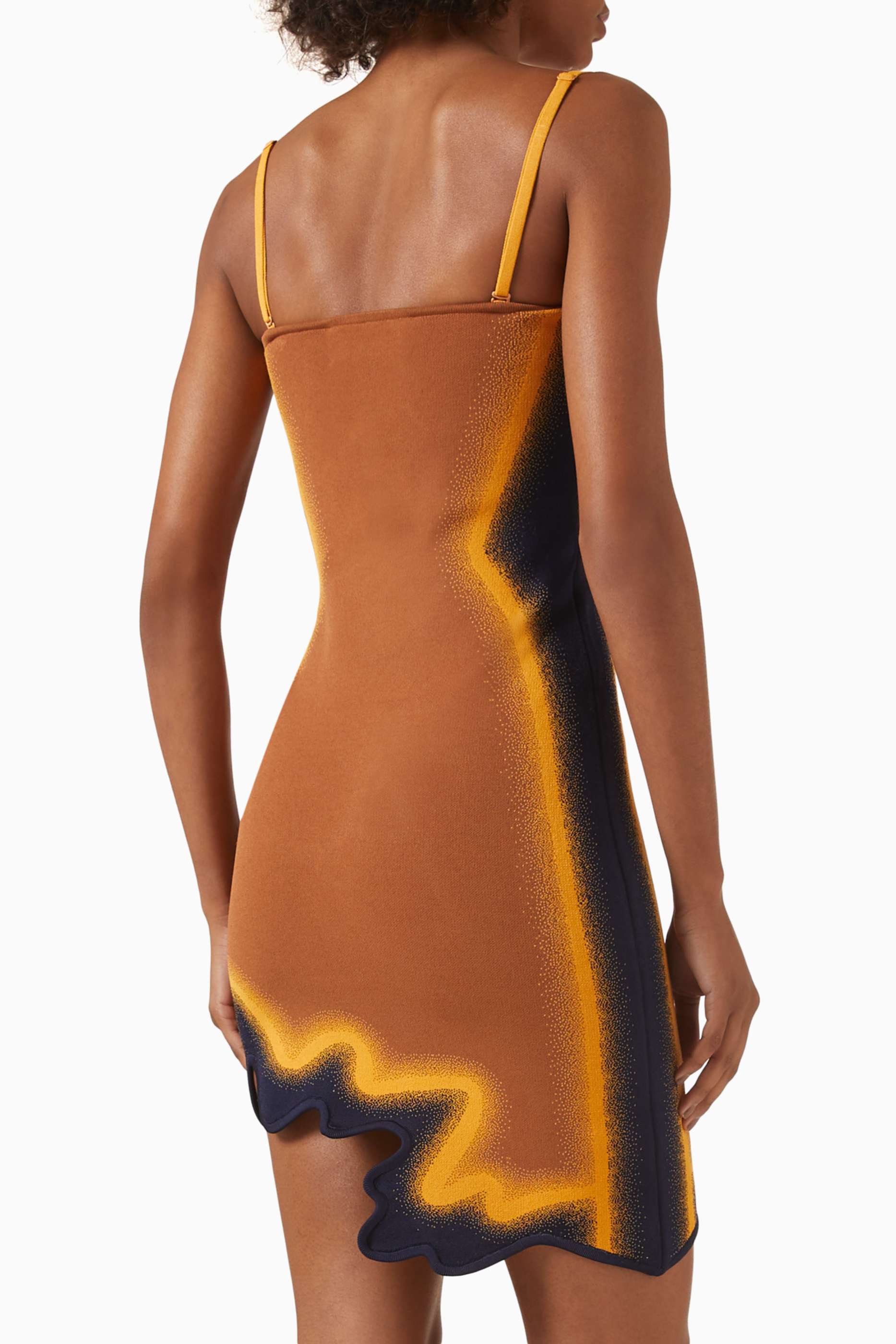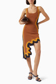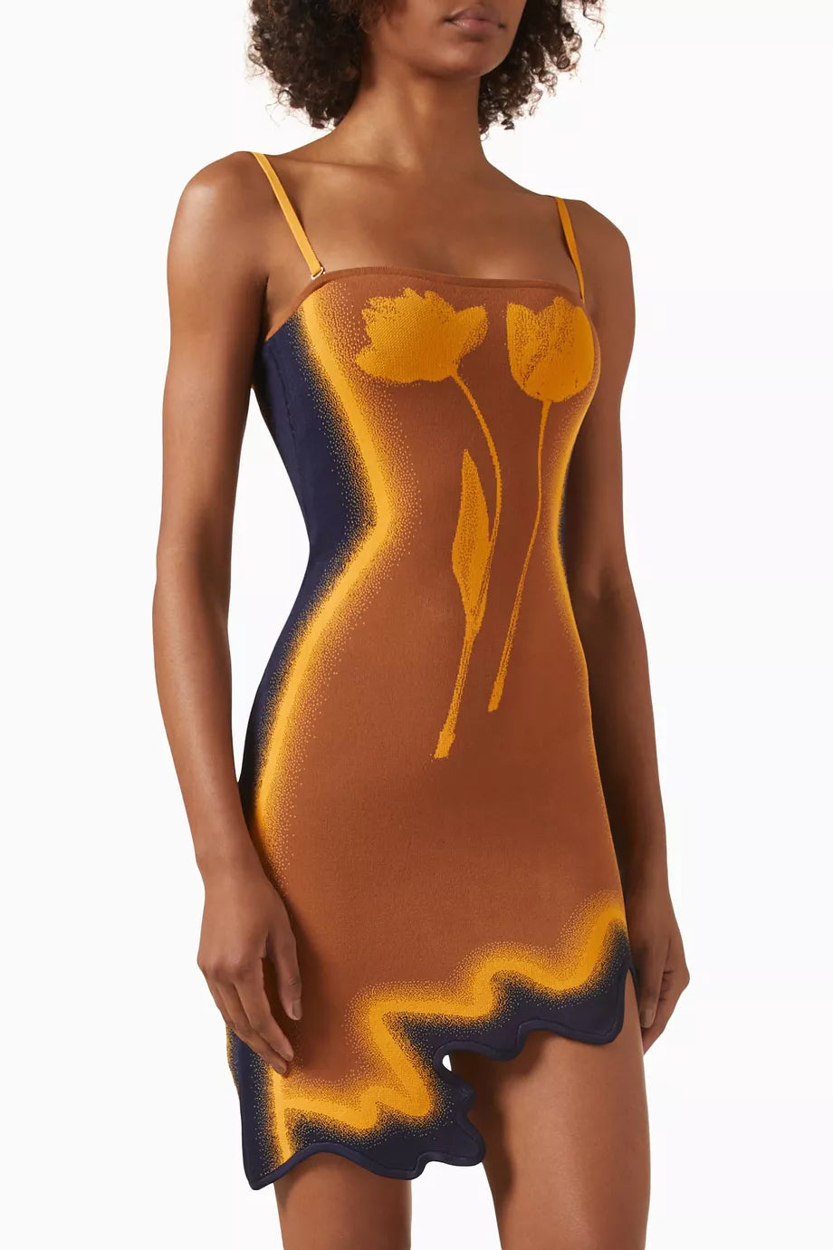 This is a mini dress with thin spaghetti straps. The dress features a unique design with a brown base color, adorned with yellow tulip - like floral prints. Dark blue accents frame the sides and bottom edge, which has a wavy, jagged hemline. The dress offers a stylish and trendy look, suitable for casual outings or warm - weather events.
