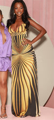 Gold & Black Striped Plunge Neck Maxi Dress