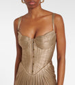 This gold maxi dress features a corseted bodice, a sweetheart neckline, and spaghetti straps for a feminine look. The pleated skirt adds a touch of sophistication, while the metallic gold fabrication lends a luxurious, alluring feel.