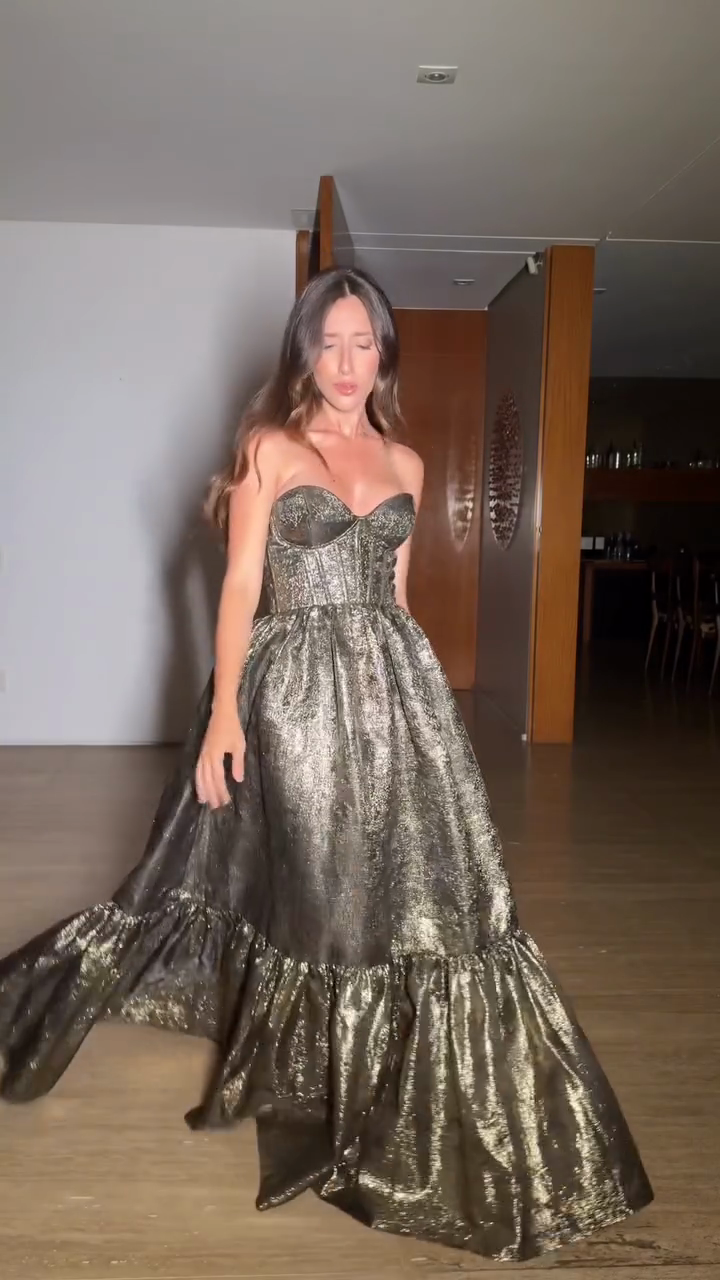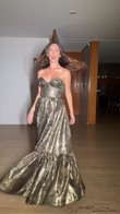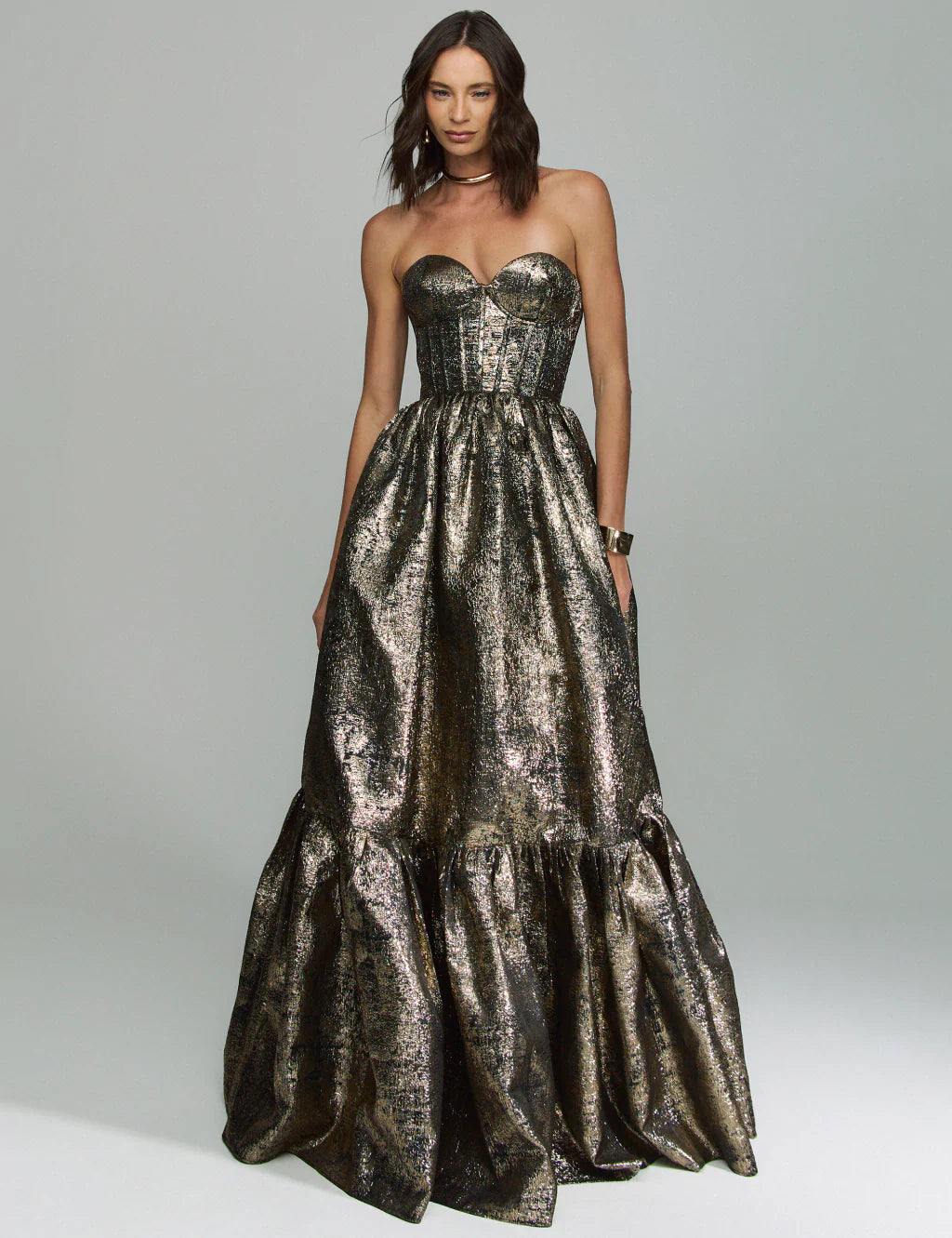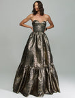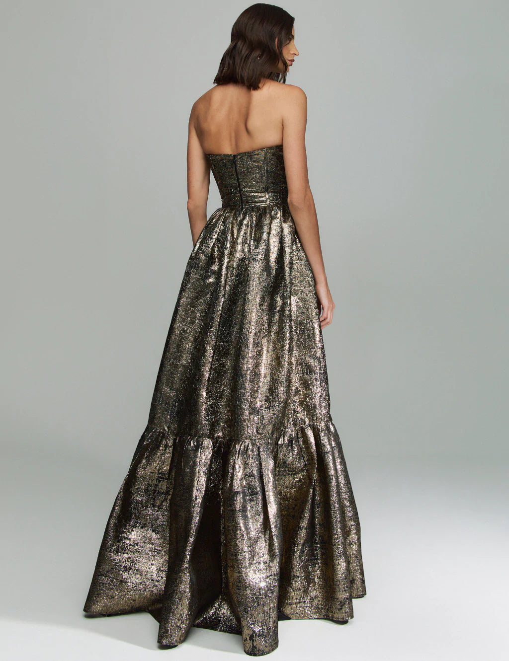 This gown is crafted from shimmering gold metallic brocade, featuring a strapless design and tiered skirt for an elegant look. Pair it with gold jewelry and matching heels to elevate your style for formal occasions.