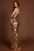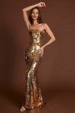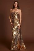 The sequined fabric is not only visually striking but also allows for ease of movement, ensuring comfort throughout the event. The off-the-shoulder design provides support, making it suitable for extended wear.