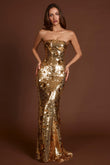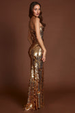 This gold off-the-shoulder maxi dress, embellished with dazzling gold and bronze sequins, creates a stunning visual impact. The slim fit hugs the body, accentuating curves, while the off-the-shoulder neckline adds an elegant touch.