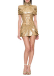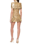 This mini dress is made of gold-textured fabric and adorned with delicate beads and sequins. Paired with a matching shawl, it exudes elegance. Adding gold strappy heels and eye-catching earrings further enhances its sophisticated charm.
