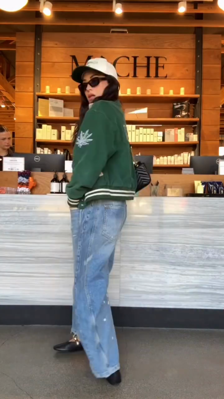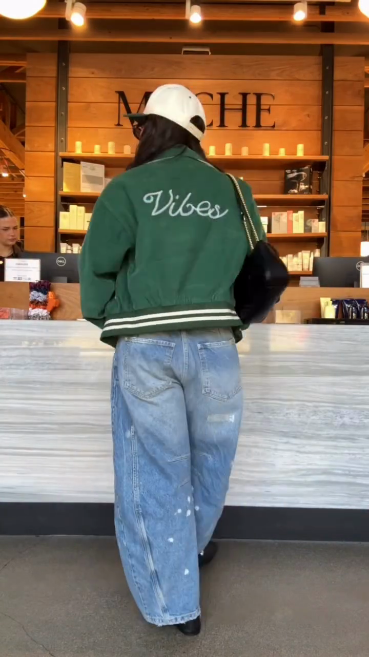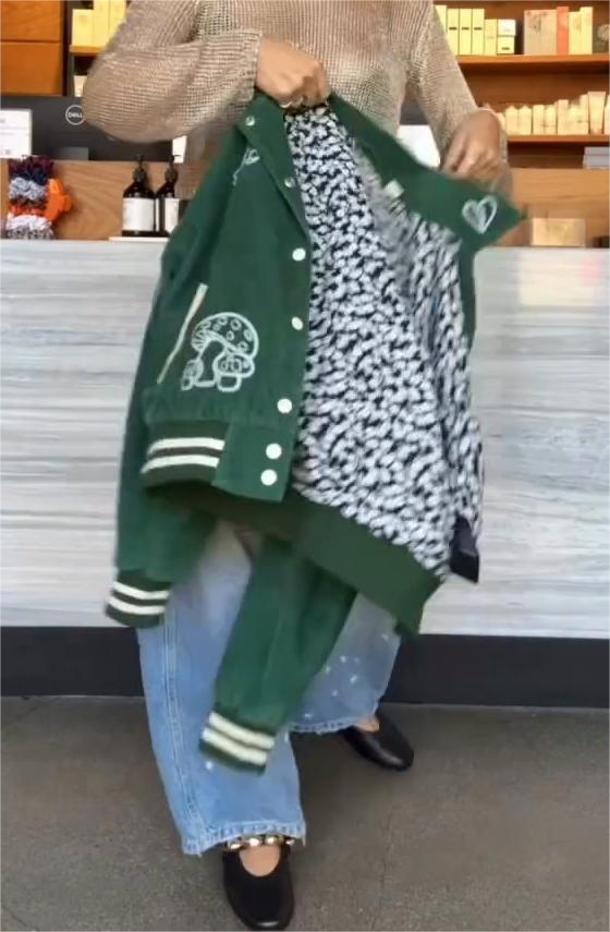 This green bomber jacket features charming embroidered details for a playful touch. A contrasting black and white graphic lining adds visual interest.