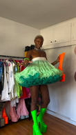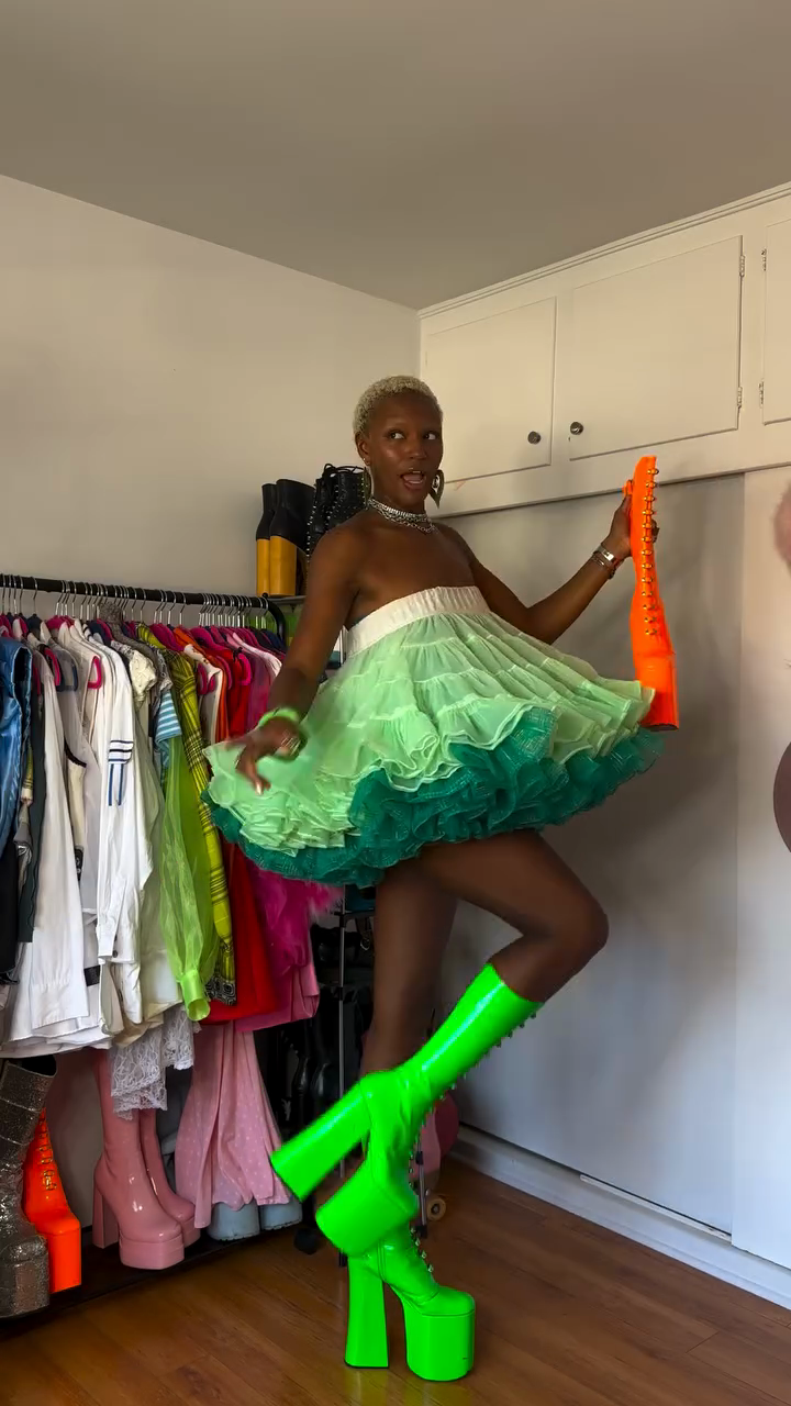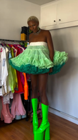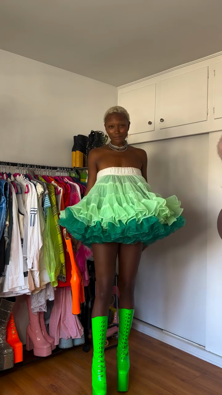 This off-the-shoulder mini dress features a voluminous tutu-like silhouette in a green and white colorway. Cascading ruffles create a playful, eye-catching silhouette. Paired with vibrant neon green platform boots, the look is bold and edgy, both for a trendy and fashionable look.