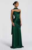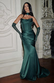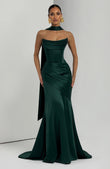 This gown is crafted from luxurious emerald green satin and features a strapless mermaid silhouette. The draped bodice adds a delicate touch, while the fitted waist accentuates the figure. The flowing skirt creates a dramatic train, creating a refined and elegant look.