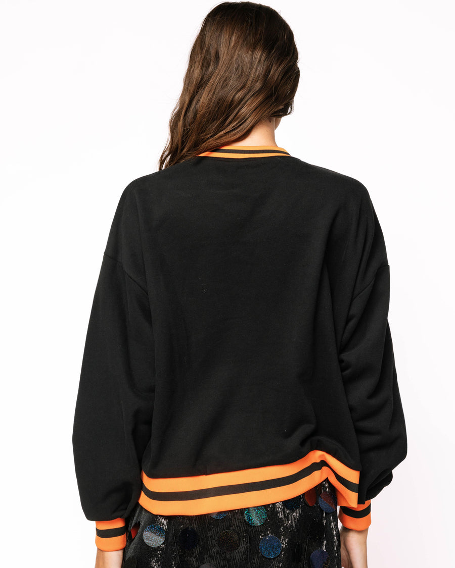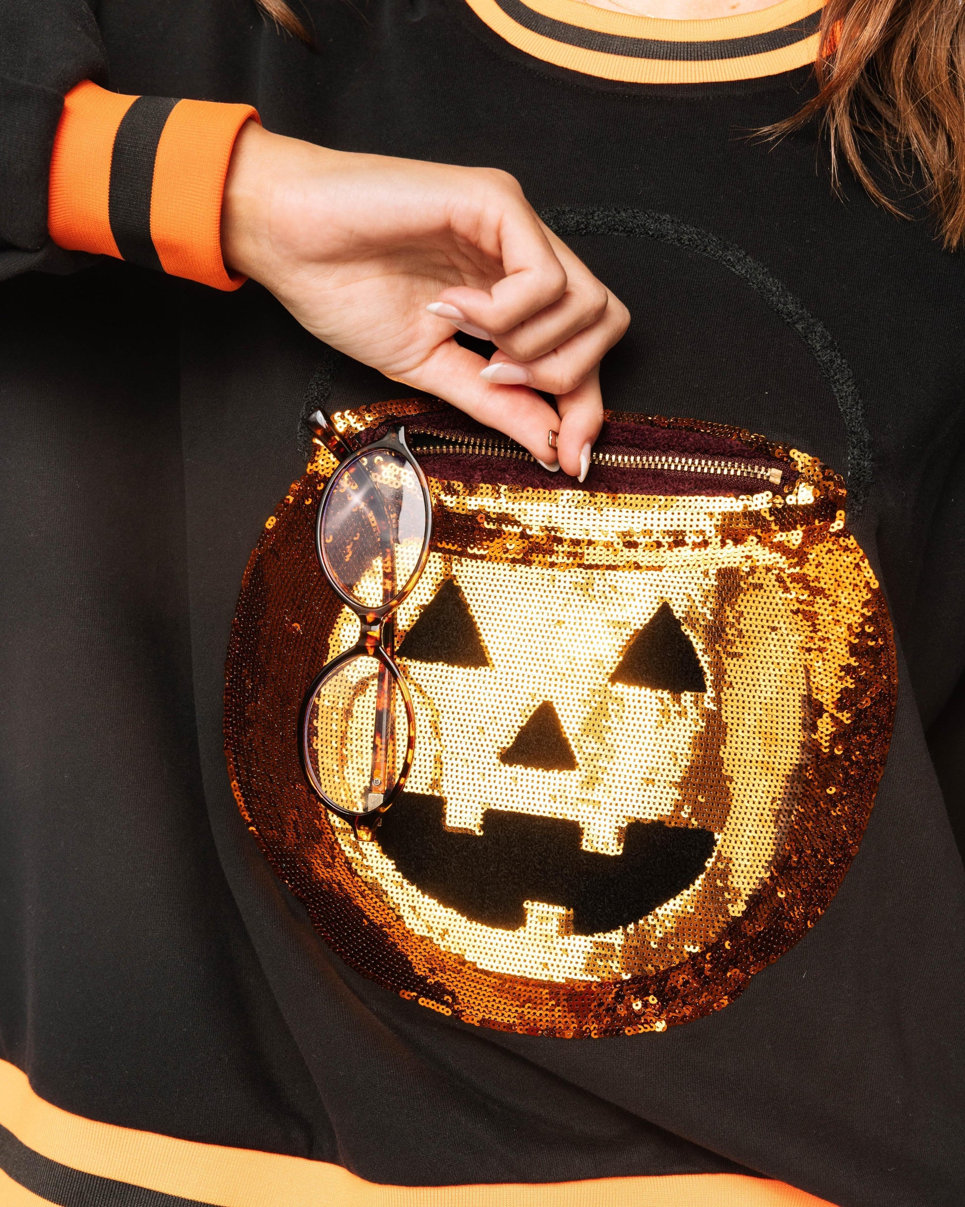 This black sweatshirt adds a playful touch to Halloween fashion. A striking large sequined pumpkin pattern adorns the front, making it a must-have for any Halloween event. Orange and black stripes along the neckline, cuffs, and hem add a sporty and festive touch.