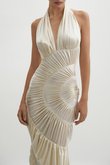 This cream-colored maxi dress features a plunging V-neck and an open back, creating a captivating and sophisticated look. Delicate ruffles and ruching, particularly the spiral design at the bodice, add a touch of artistic elegance and femininity. The flowing skirt, with its cascading ruffles, adds a touch of graceful movement.