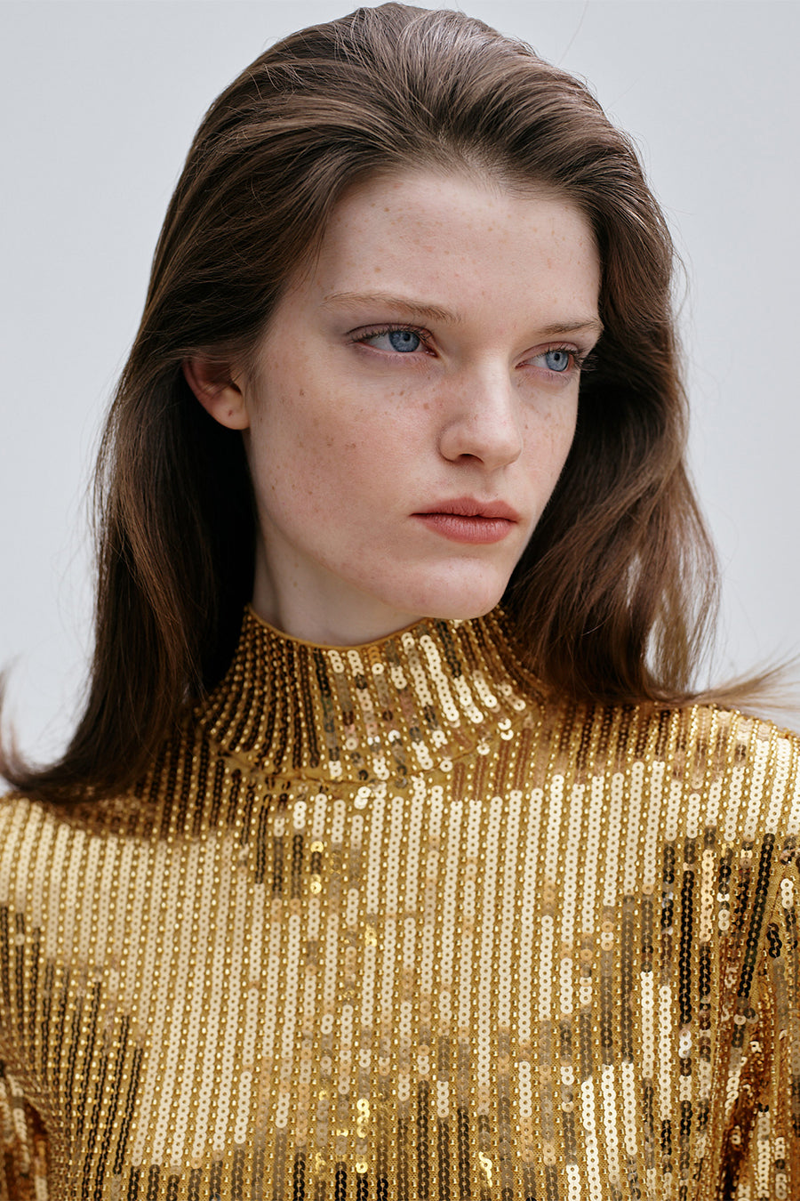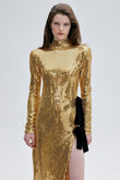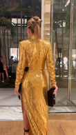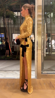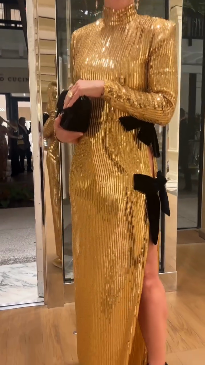 This gown, crafted from gold sequined fabric and adorned with a black velvet bow, features a high neckline, long sleeves, and a side slit for added allure. It perfectly blends luxury and bold design, making it ideal for red carpet events and evening banquets, helping you create a glamorous look. Pair it with black high heels and minimalist jewelry to further accentuate the gown's exquisite details.
