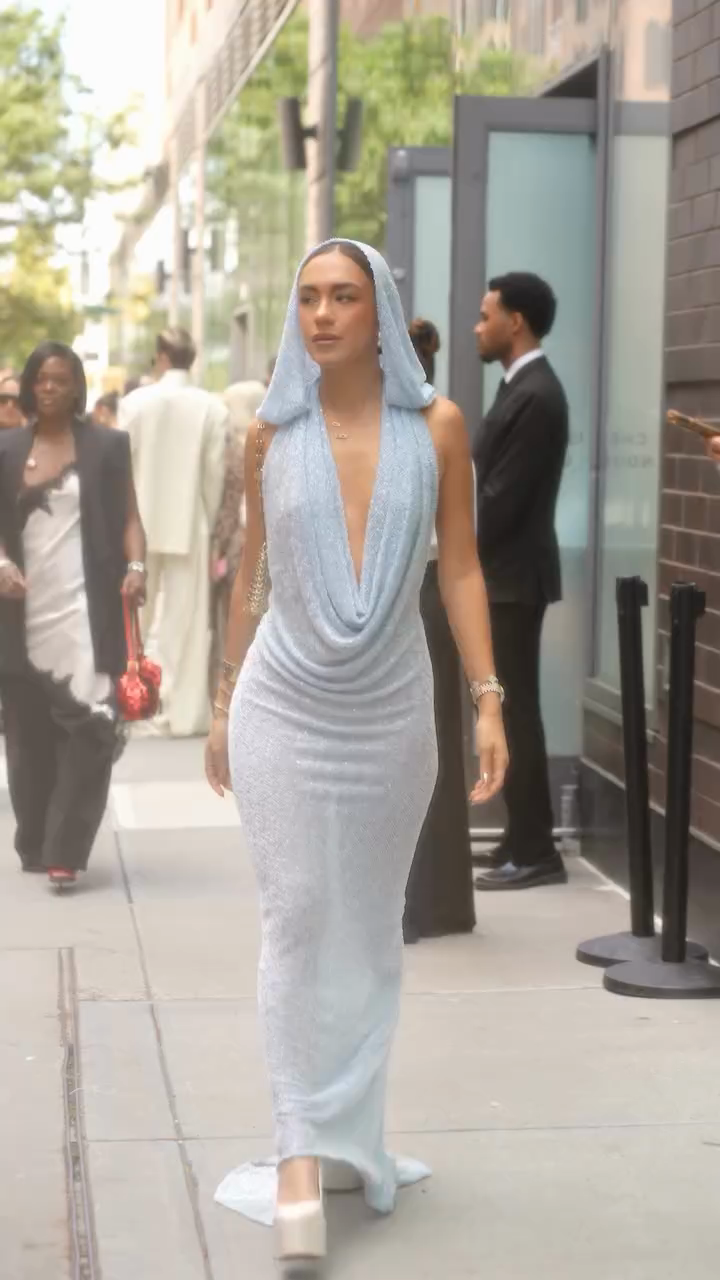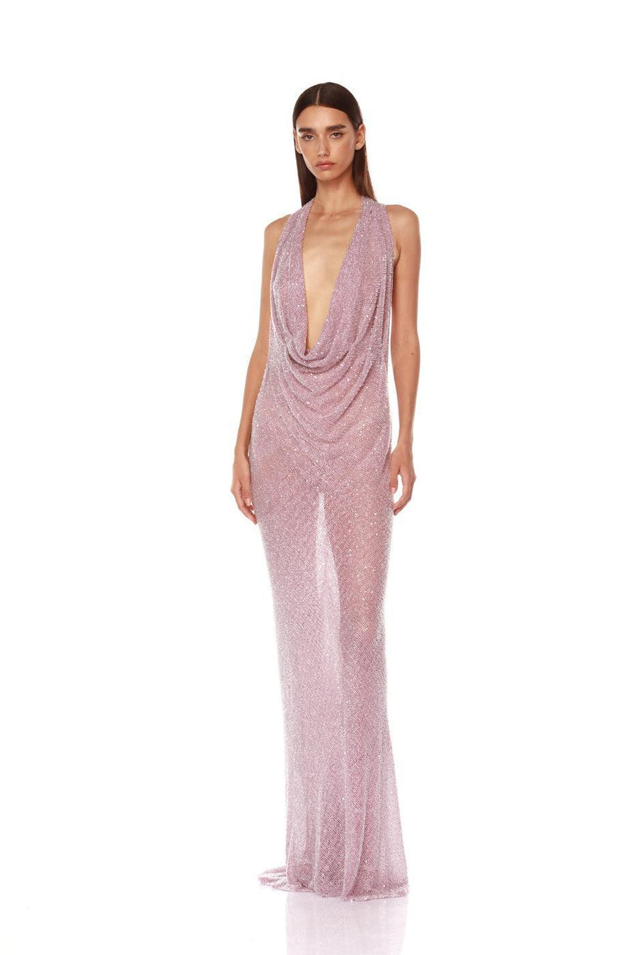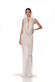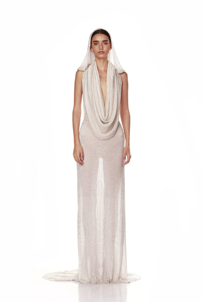 This maxi dress features a distinctive halterneck and hood, creating a unique and elegant look. The plunging V-neckline adds a touch of allure, while the flowing fabric hugs the body with grace. The slim fit flatters the figure, while the hood adds a touch of sophistication and elegance, making it the perfect choice for high-end events, red carpets, or evening gala dinners. Made from premium, shimmering fabric, it catches the light for a captivating sheen. It drapes beautifully, offering both comfort and style.