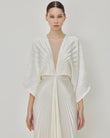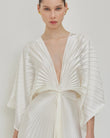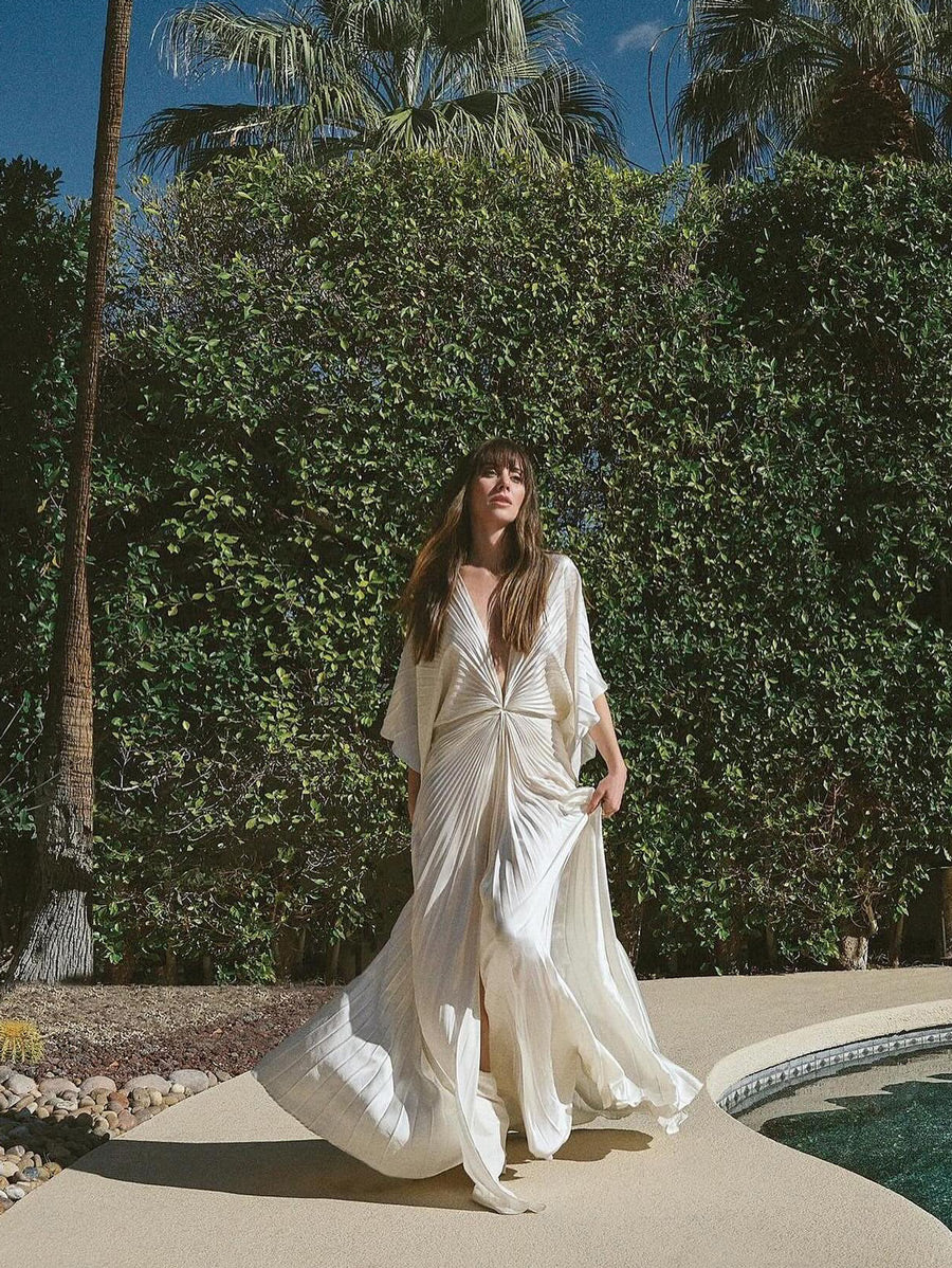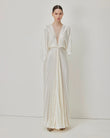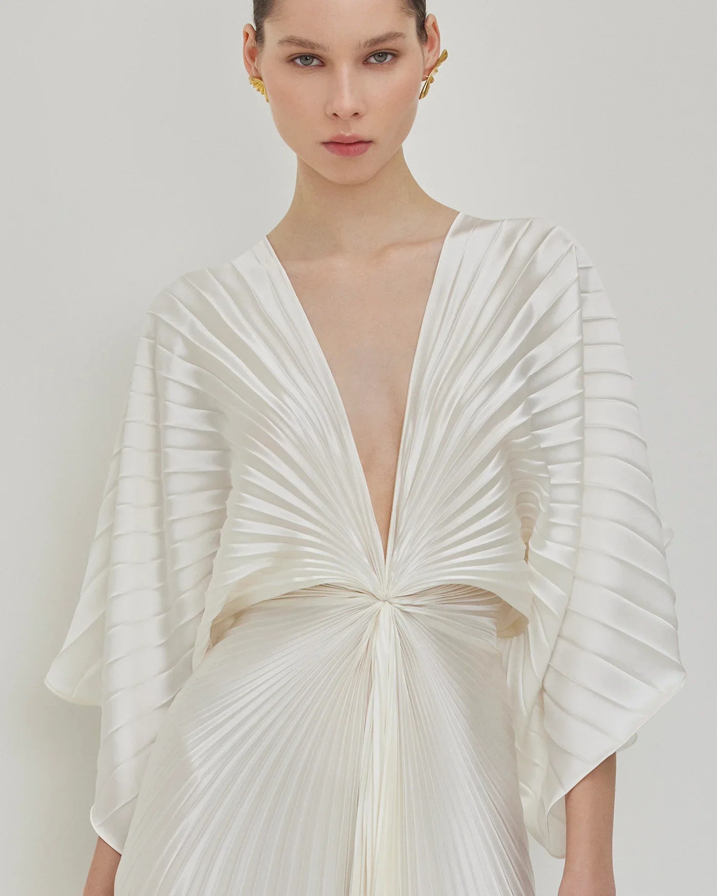 This ivory satin dress features a plunging silhouette, ruched detailing, a knotted waist, and a mid-length. Pair it with metallic heels and minimal jewelry for the perfect formal evening look.