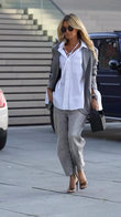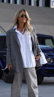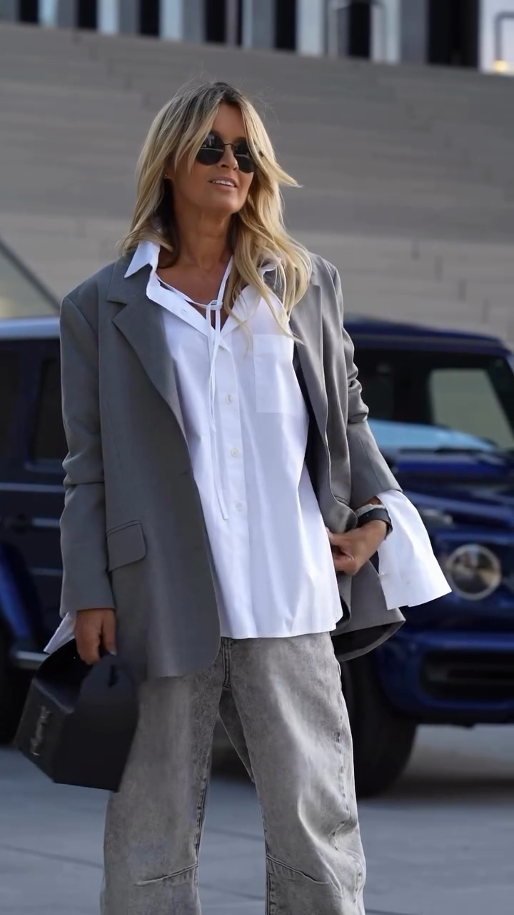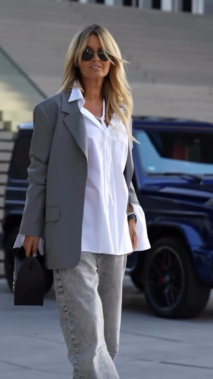 Jeans with Casual Chic Streetwear and with a white button - down shirt that has a tie detail at the neckline and an oversized gray blazer. Accessories include black sunglasses, a black handbag, and strappy black high - heeled sandals. Suggesting a stylish and contemporary casual look suitable for city outings or social events.