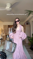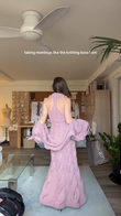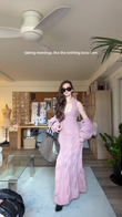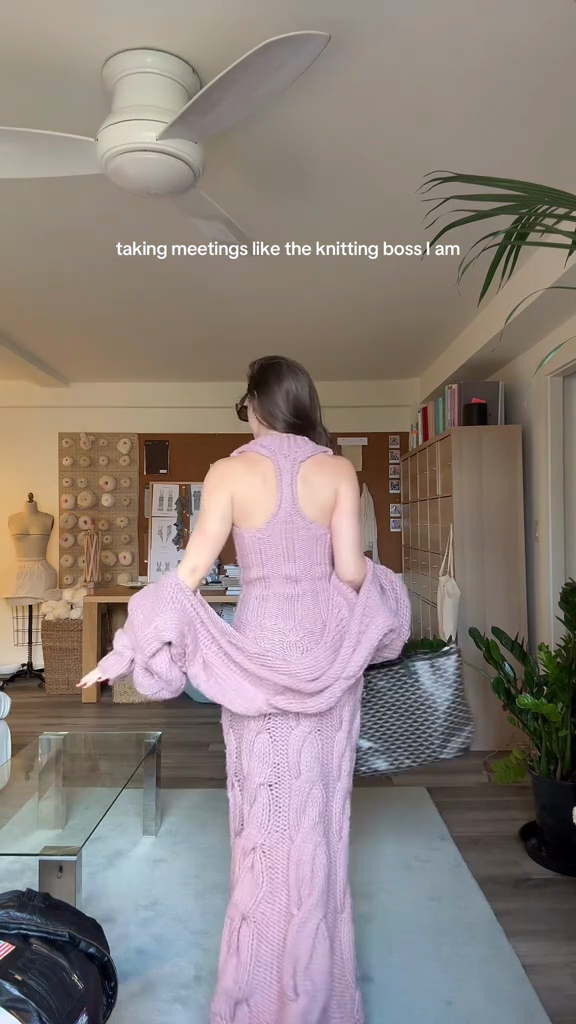 This long dress is crafted from soft, pastel-purple cable-knit fabric for warmth and style. The plunging V-neckline adds a touch of femininity, while the delicate cable-knit pattern showcases the craftsmanship. The detachable, oversized sleeves offer versatile styling options, allowing for a variety of looks depending on the occasion.