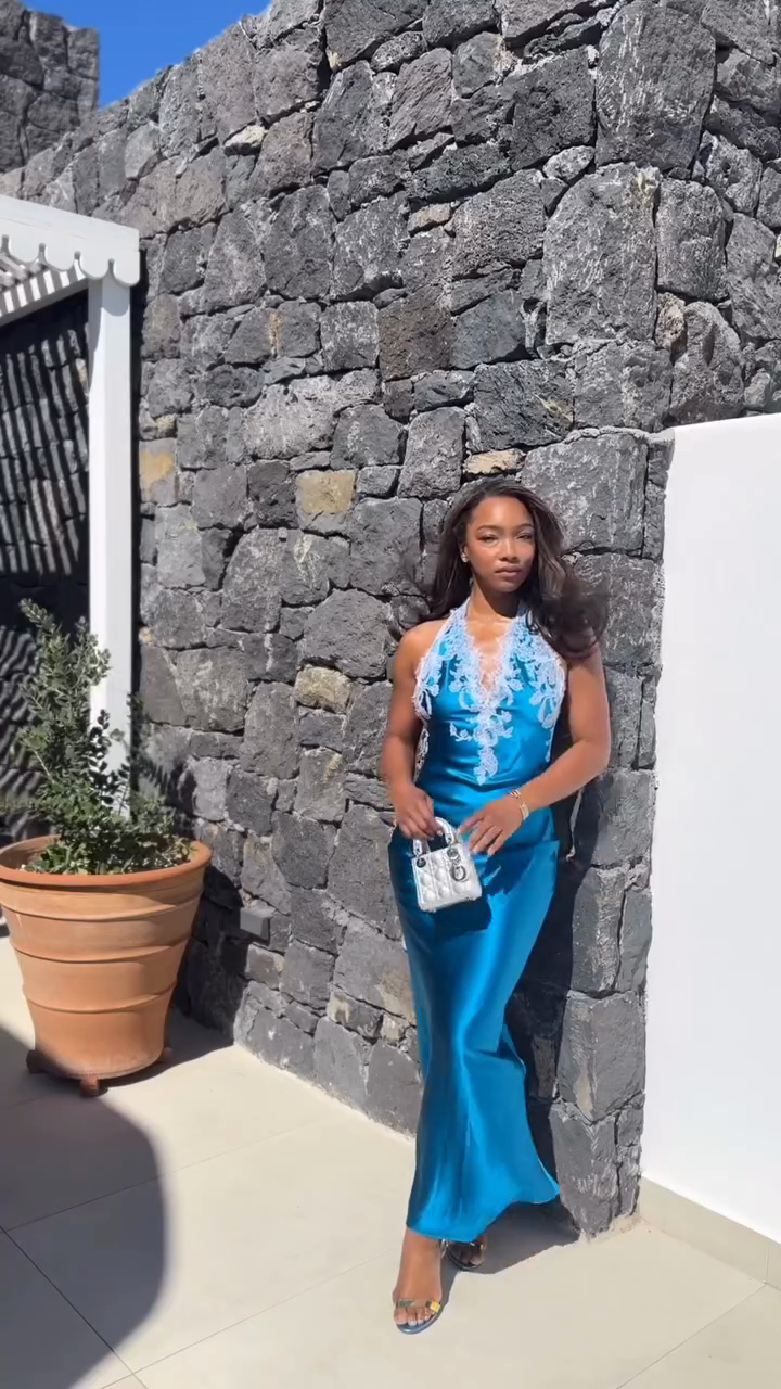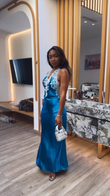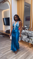 This dress is crafted from smooth satin for a luxurious sheen. The open back accentuates shoulders, while the plunging V-neckline adds a touch of allure. White lace embroidery adorns the bodice, creating a striking contrast against the vibrant turquoise, adding a touch of femininity. The slim-fitting silhouette elongates the figure.