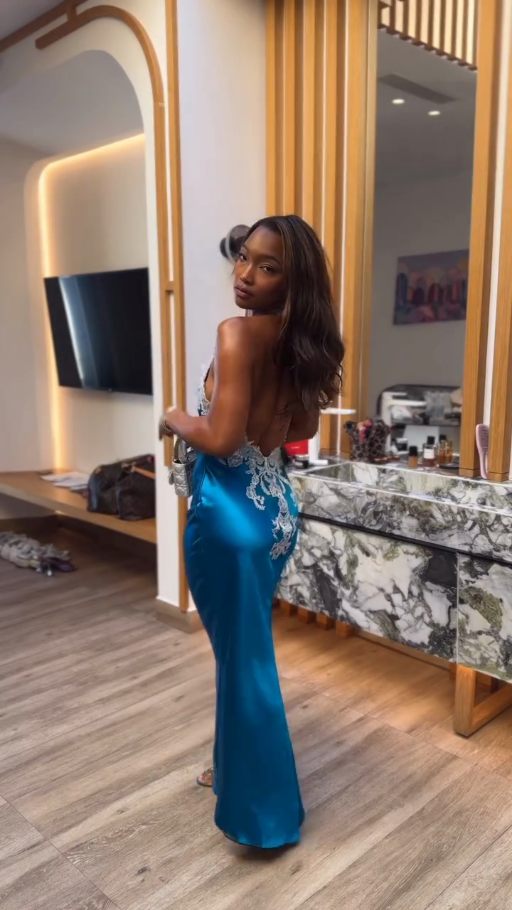 The dress is comfortable, and the satin fabric feels smooth to the touch. The open back provides support, while the slim-fitting silhouette allows for full range of motion, allowing the wearer to move confidently.