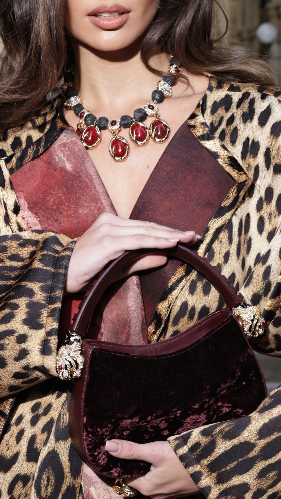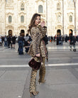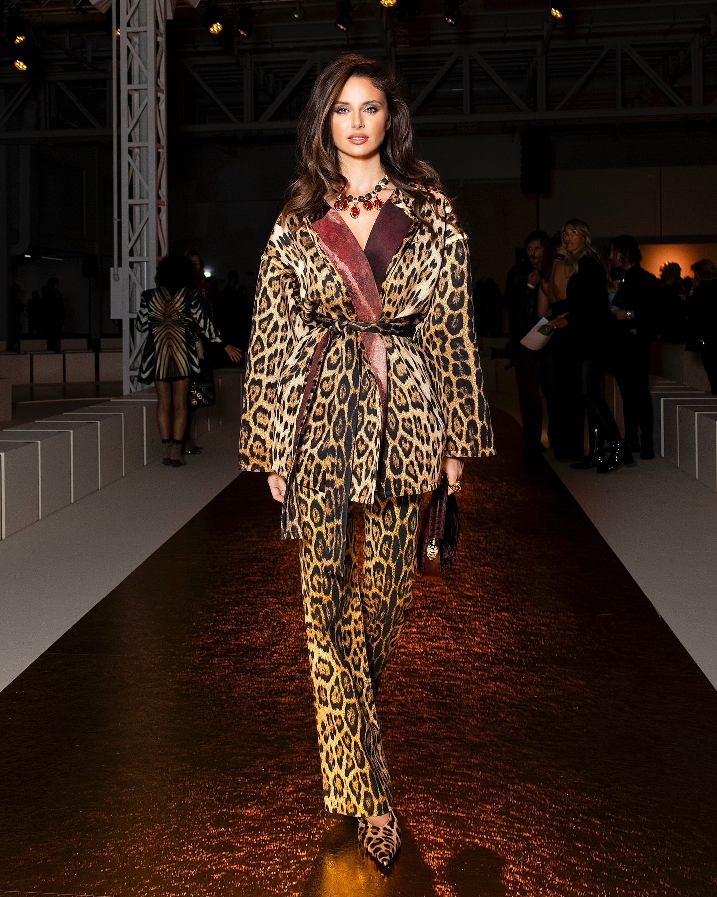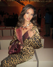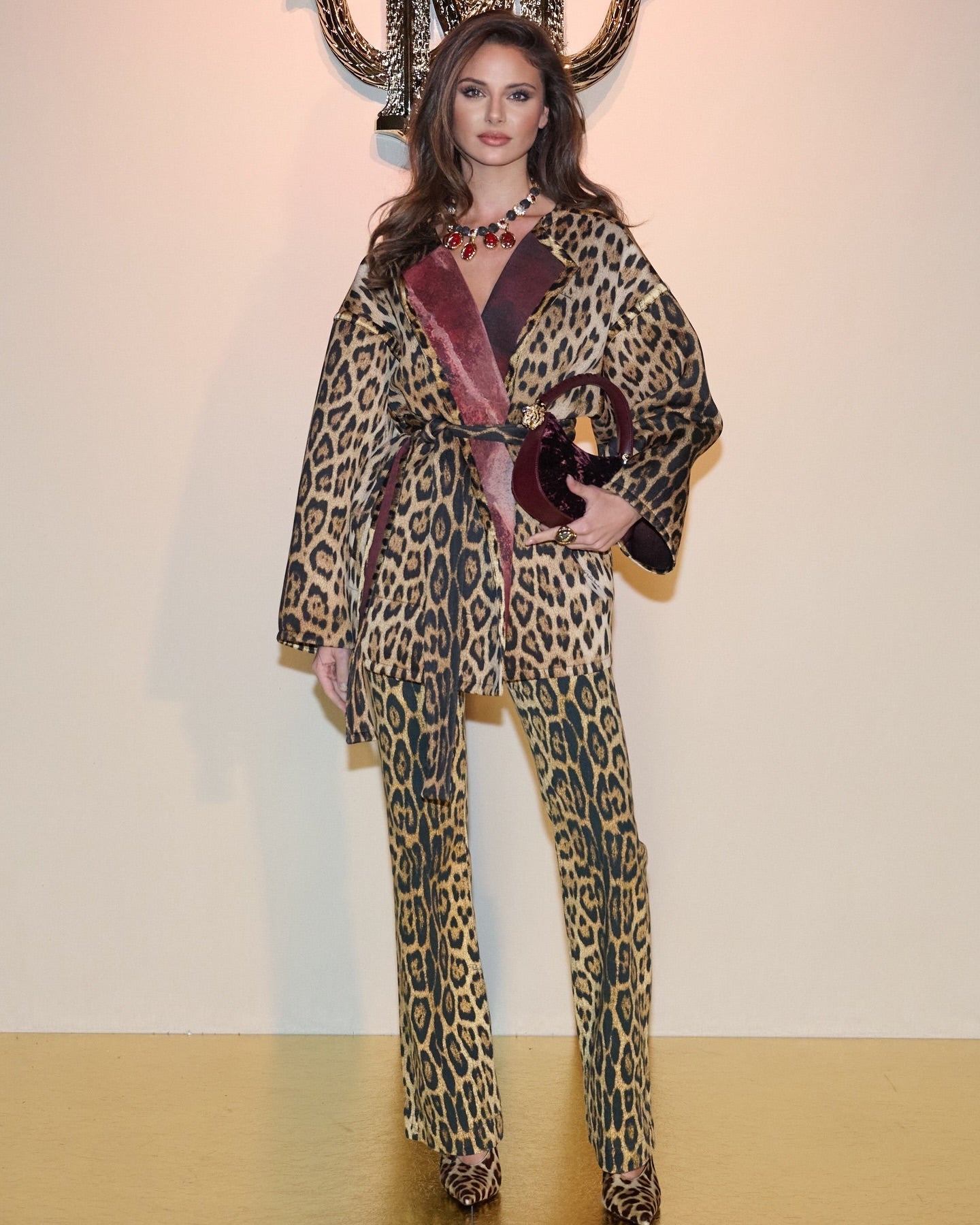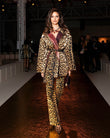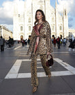 This leopard-print jacket paired with leopard-print trousers creates a bold yet harmonious look. The jacket features a lapel and ties at the waist, creating a sleek silhouette. The contrasting red lining adds a touch of elegance and pop of color.