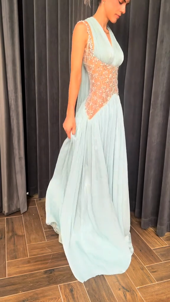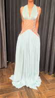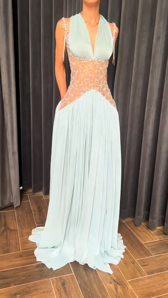 This light blue evening gown features a plunging V-neckline and fitted bodice, embellished with delicate beads and crystals for a captivating and sophisticated look. The flowing pleated skirt adds elegance, while the sheer, beaded midi skirt adds even more glamour.