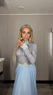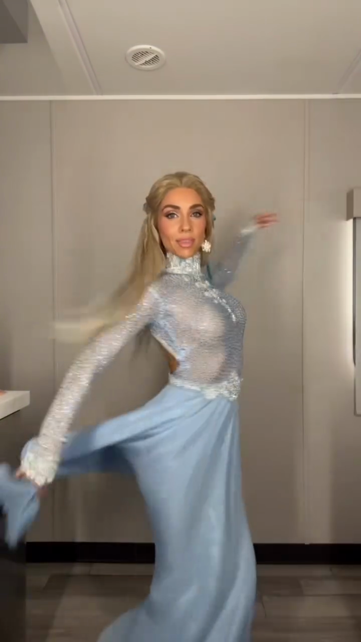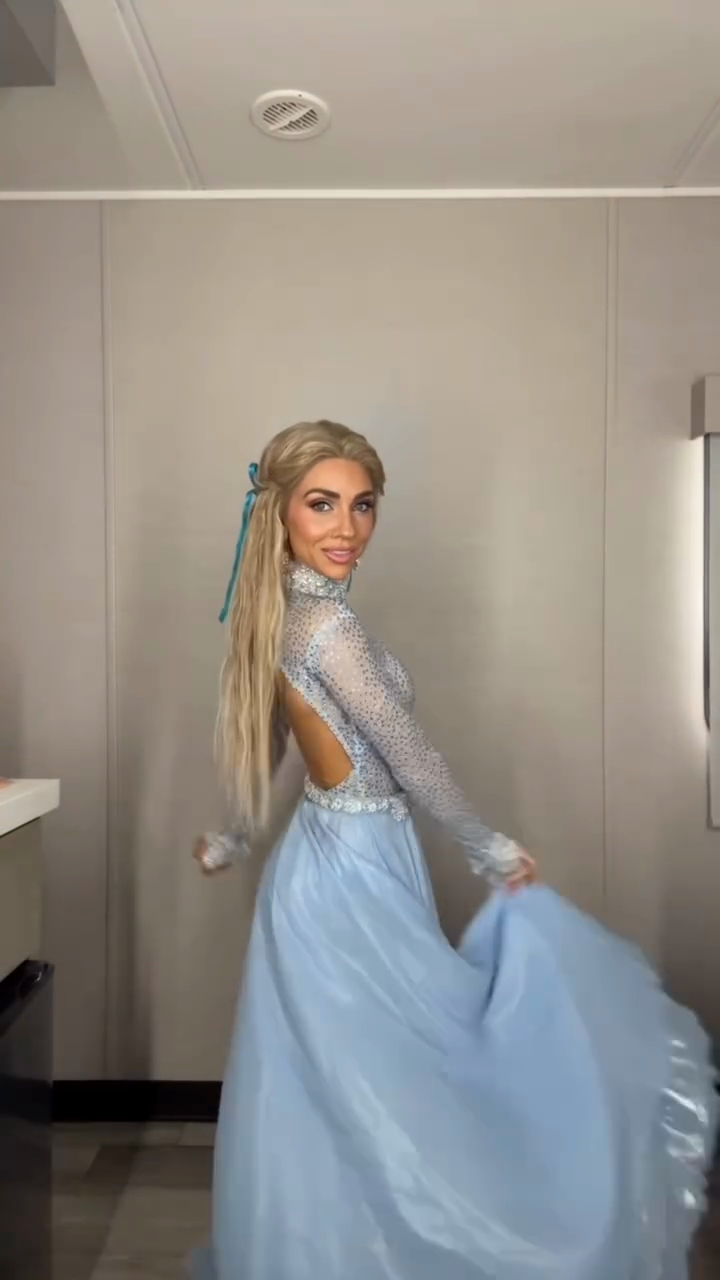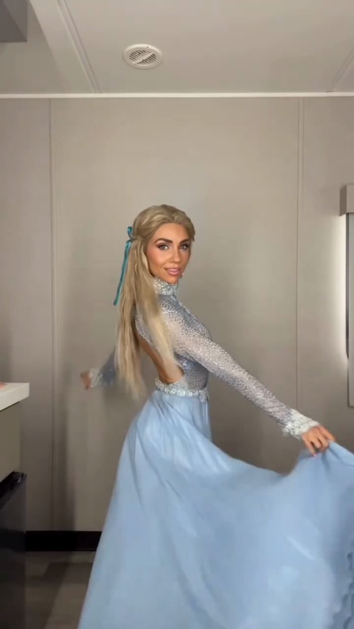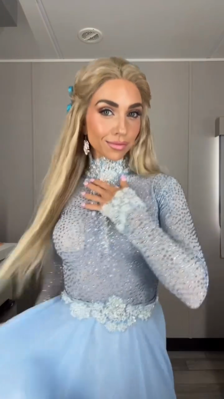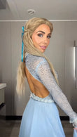 This light blue gown is inspired by Elsa's iconic look. It features a sheer, shimmering bodice with intricate detailing and a flowing, floor-length skirt, elegantly capturing the character's magical allure.