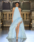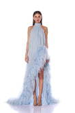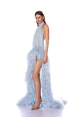 This stunning light blue halter-back gown features a high neckline that elegantly frames the shoulders and neck. The bodice is crafted from a flowing, sheer fabric, creating a delicate, airy feel. Luxurious feathers accent the sides of the skirt, adding a touch of luxury and movement. Highly slit side skirts further elevate the gown's allure, adding a touch of elegance and movement. Paired with embellished heels, this gown is perfect for formal occasions, from evening parties to red carpets. Its unique and captivating design is sure to make you stand out.