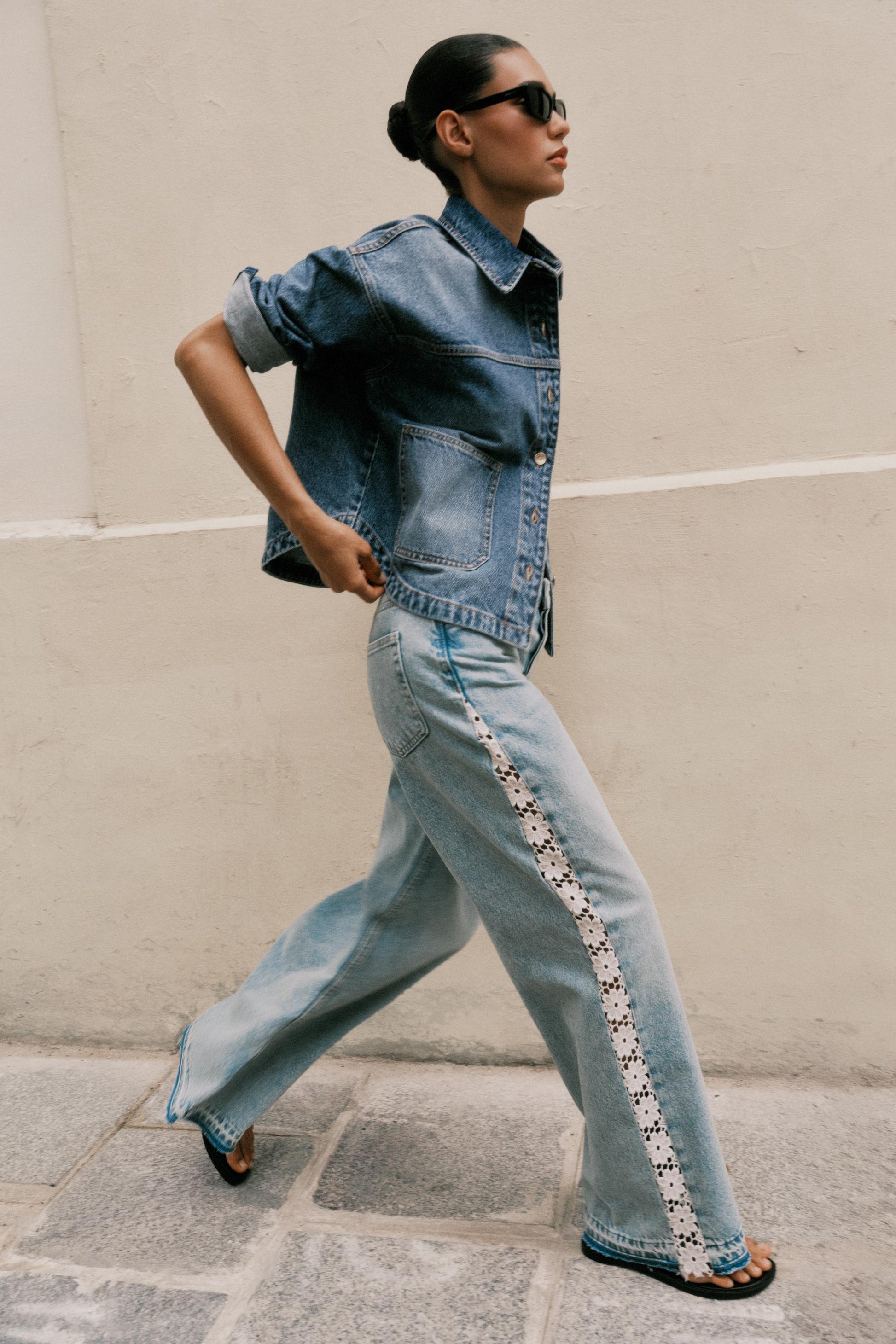 These light blue wide - leg jeans feature an eye - catching lace trim running down the outer sides of the legs, adding a feminine and unique touch to the classic denim look. Paired with black flat - strap sandals, the jeans offer a casual yet stylish outfit option, suitable for a laid - back day out, shopping, or a casual meet - up with friends.