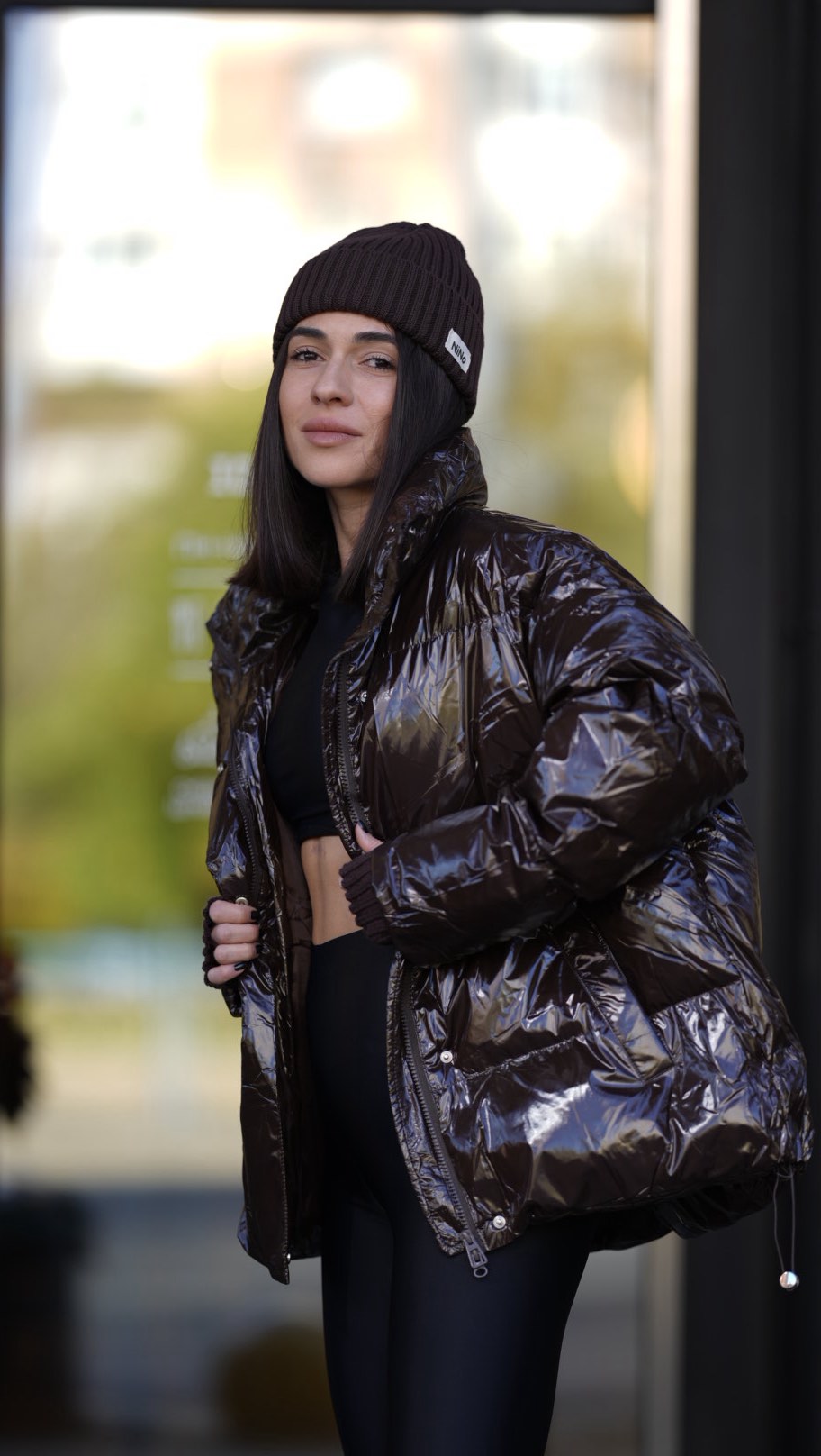 This down jacket features a smooth, lustrous brown fabric for a modern, stylish look. The lustrous fabric makes it stand out and adds a touch of style to your winter wardrobe.