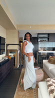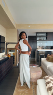 It pairs perfectly with a cropped top, like the white one shown, for a modern, stylish look. It also pairs beautifully with a shirt, sweater, or jacket, making it a versatile piece suitable for any season and any style.