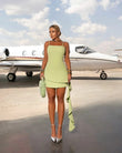 This light green mini dress features a fluid, fitted silhouette and slender straps, embodying feminine elegance. The asymmetrical ruffle detail on one side adds a playful, dynamic touch, making it unique and statement-making.