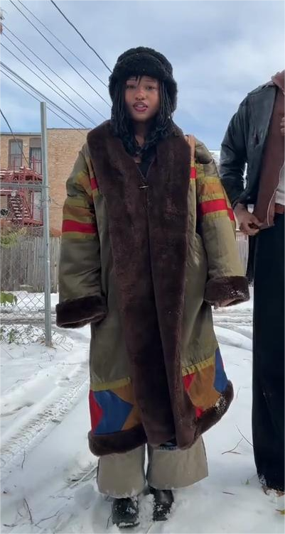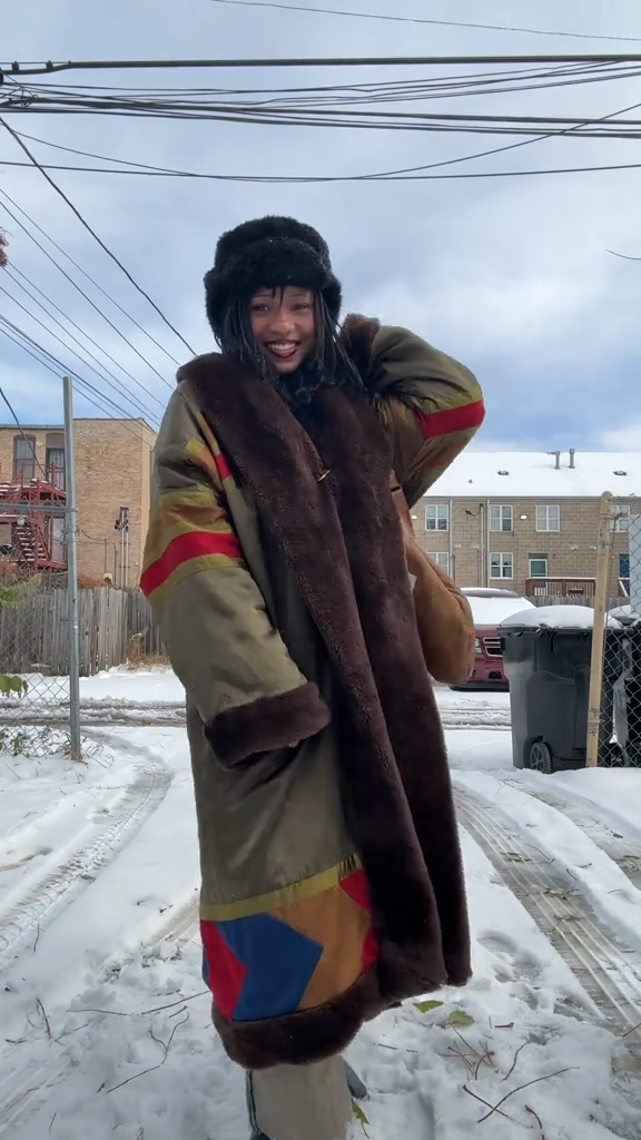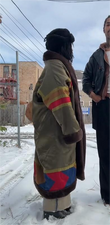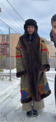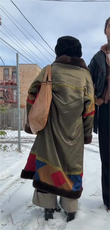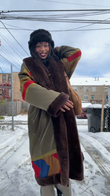 This coat features an olive green base with colorful geometric patchwork, and wide sheepskin trim on the collar and cuffs. Its relaxed fit and thick fabric make it ideal for winter outings, offering both warmth and style. Pair it with a sheepskin-lined hoodie and wide-leg trousers for a comfortable yet sophisticated look.