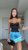This outfit features a sleek black corset top with a structured, strapless design that accentuates the bust. Paired with a bright blue miniskirt embellished with a delicate floral pattern, it creates a striking contrast and a stylish, edgy look.