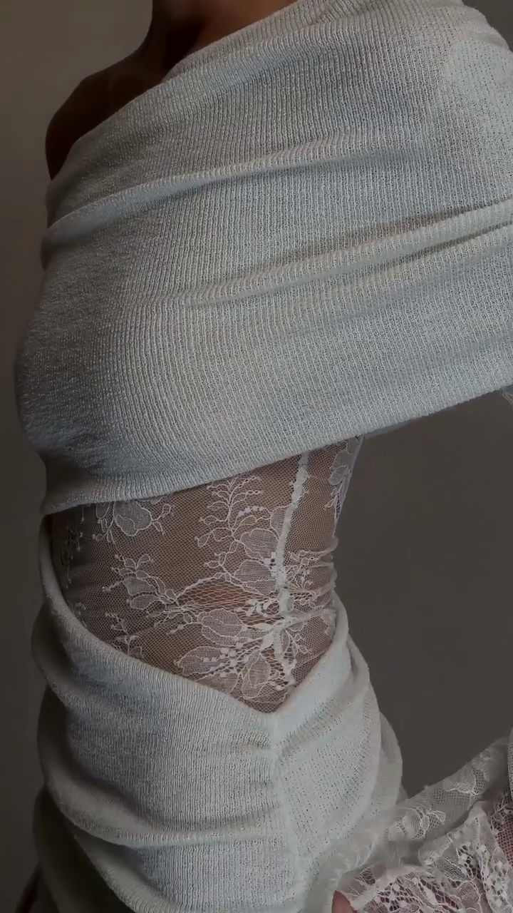 Mint Green One - Shoulder Mini Dress with Lace Sleeves