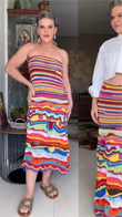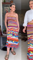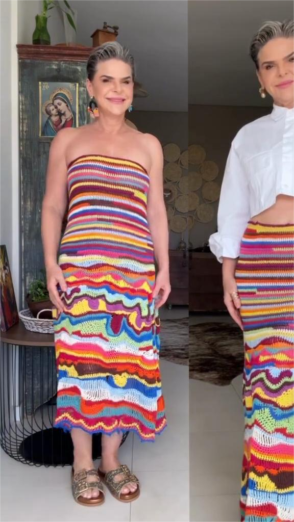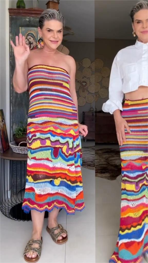 This crocheted dress boasts a rich texture and excellent breathability, while its rainbow colors and wavy pattern add a bold, artistic touch. It's easy to style and suitable for various occasions, from summer parties and casual outings to creating a bohemian or creative look.