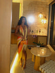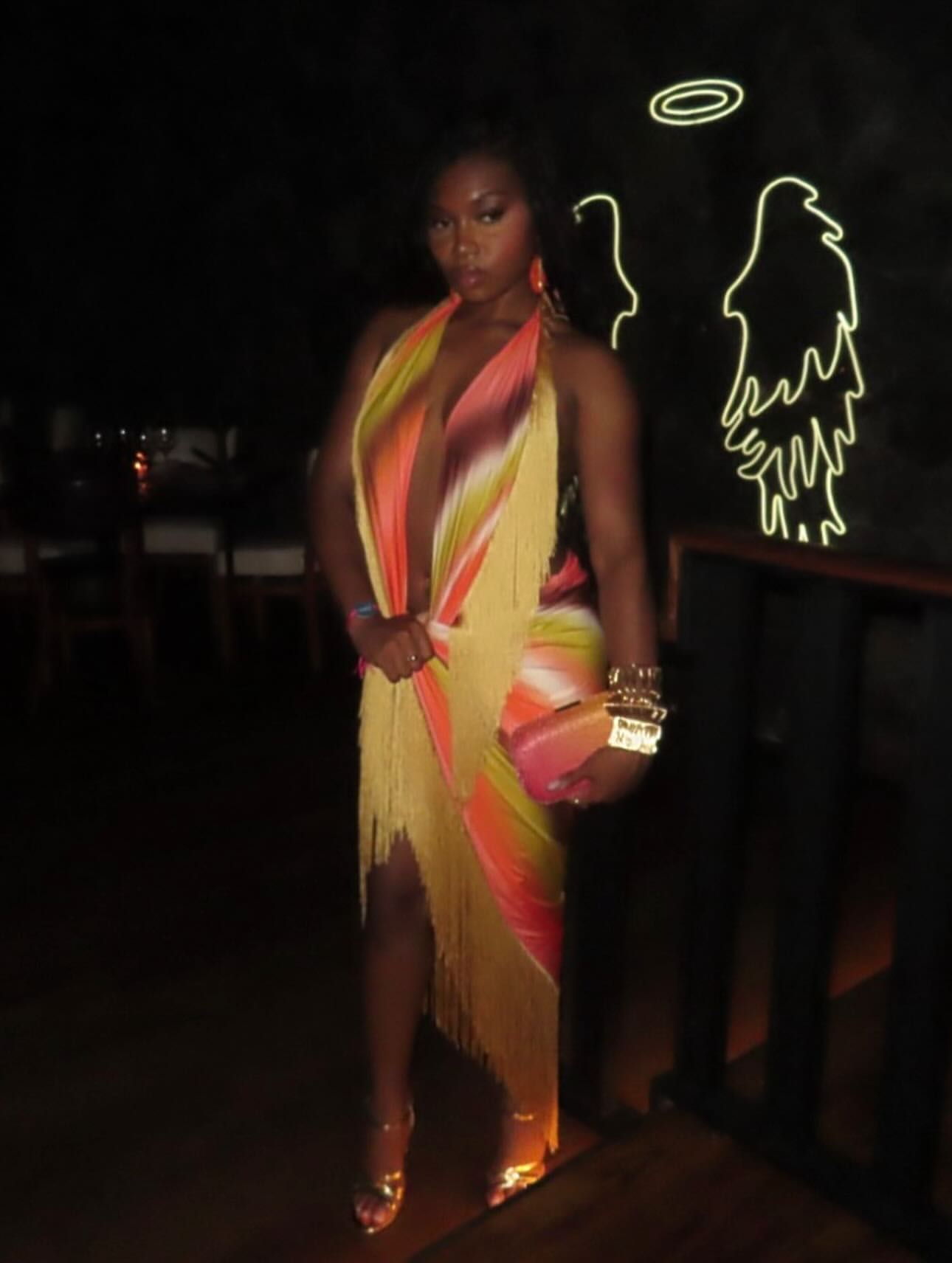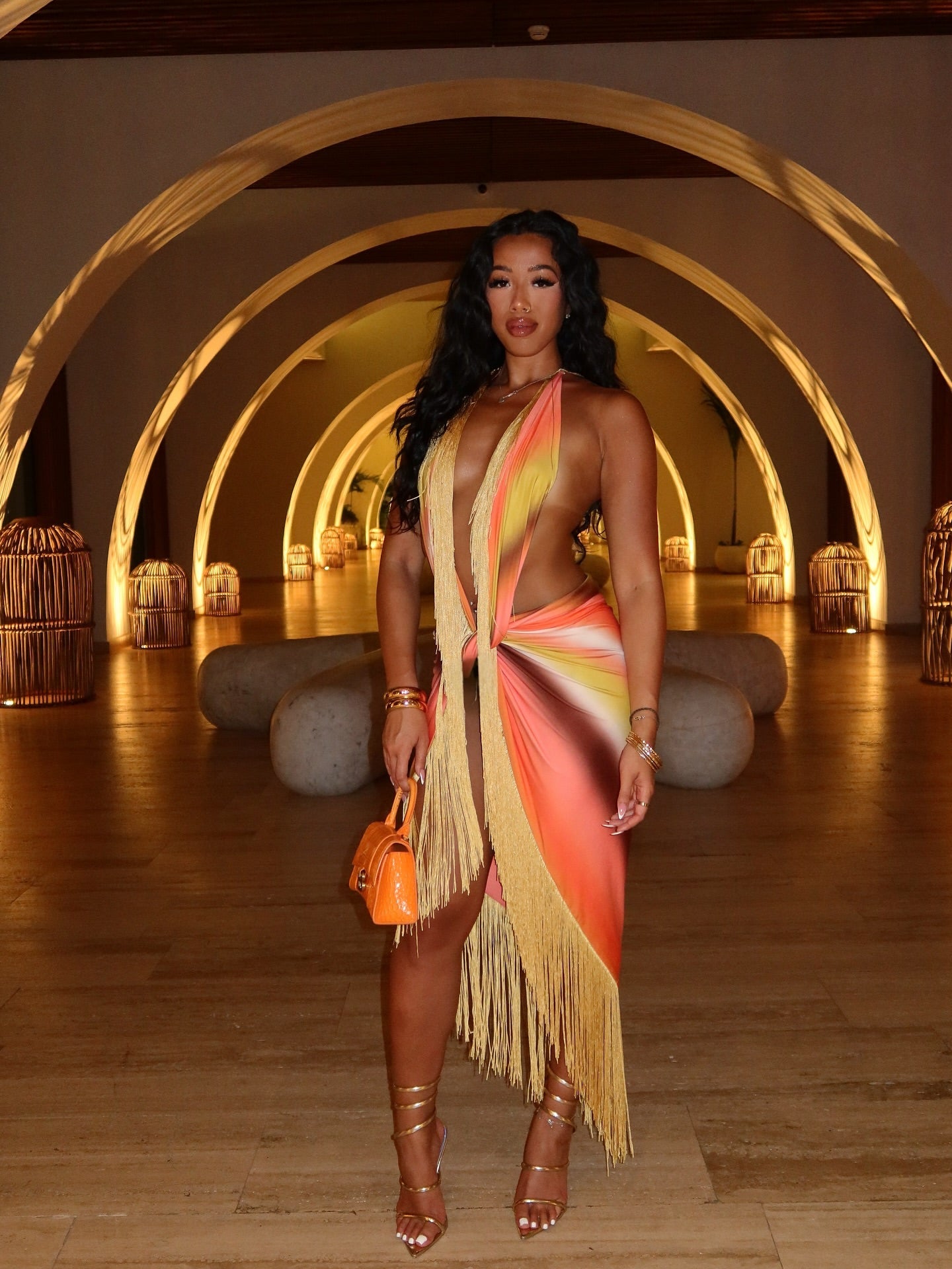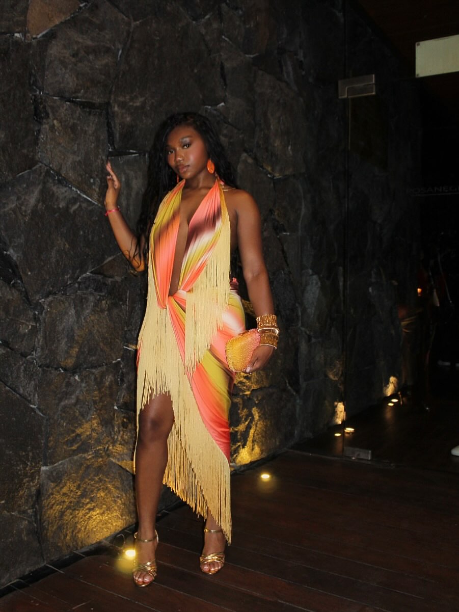 Elevate your evening look with this multi-colored fringe slip maxi dress crafted from multi-colored stretch fabric featuring fringe details, a halter neckline, and a maxi length, paired with heels and bold accessories.