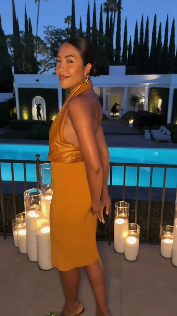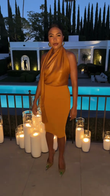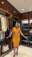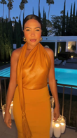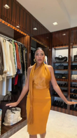 This mustard yellow set features a fitted, backless top and midi skirt, creating a flattering silhouette.