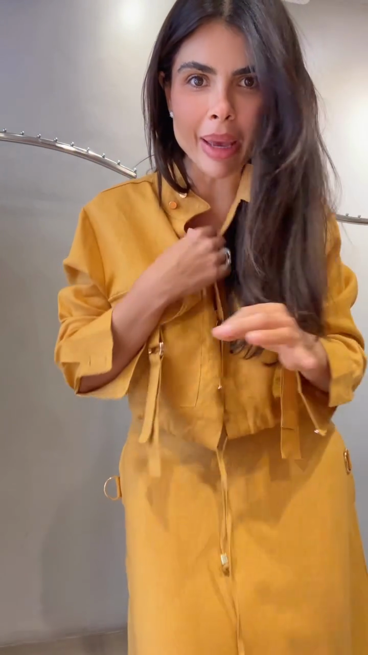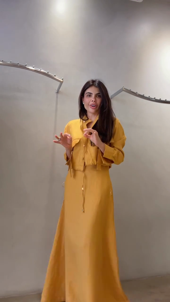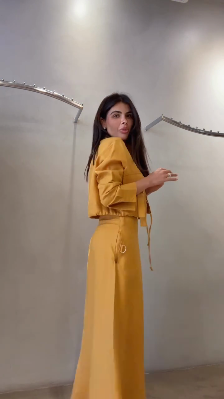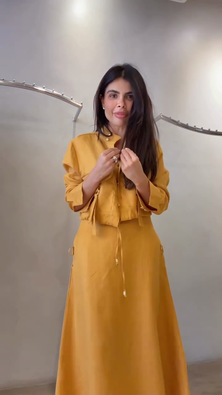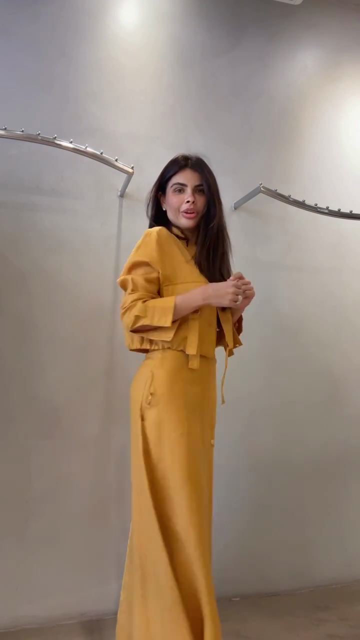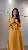 This two-piece suit in a vibrant mustard yellow creates a striking look. The button-down front and flap pockets of the cropped shirt add a touch of casual sophistication, while the matching maxi skirt is elegant and flowing, framing the figure.