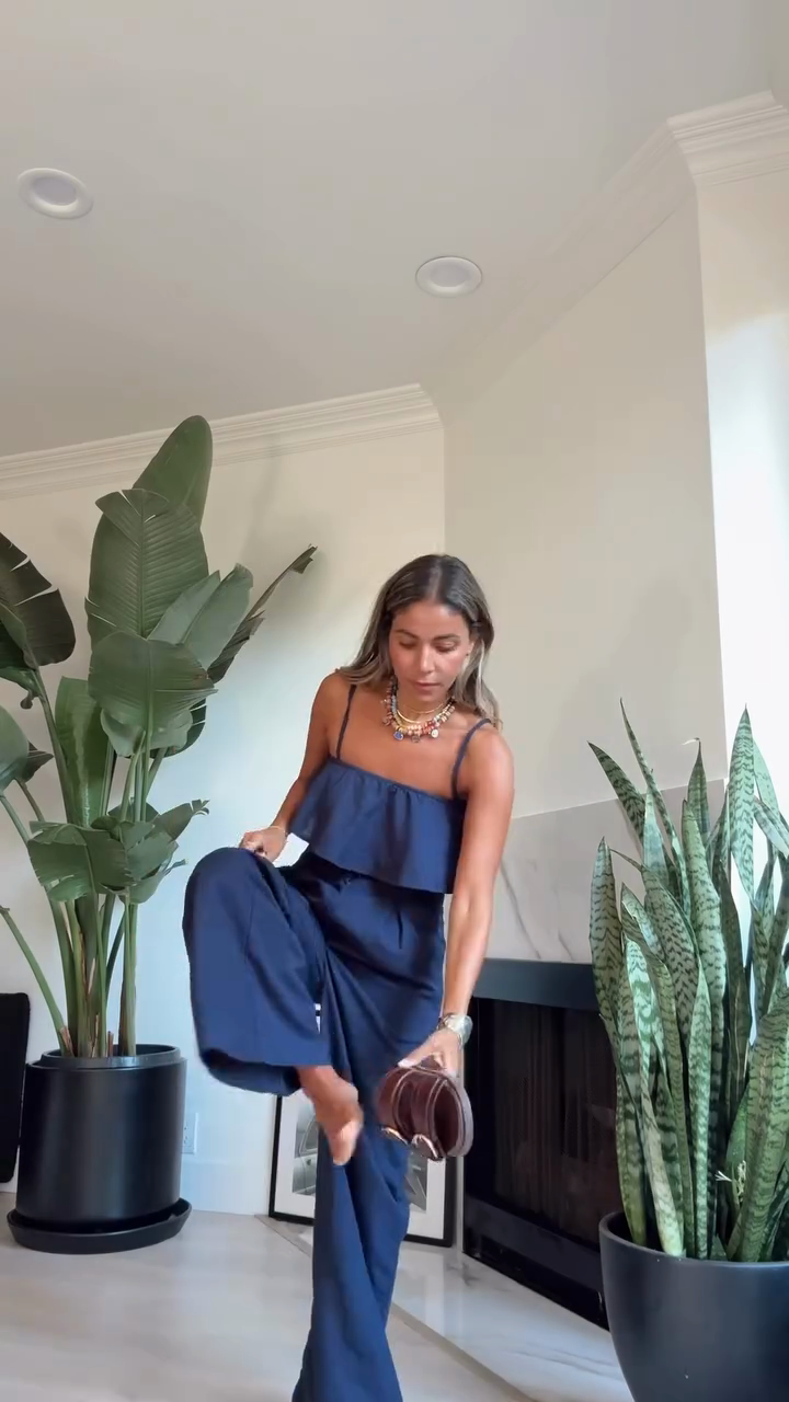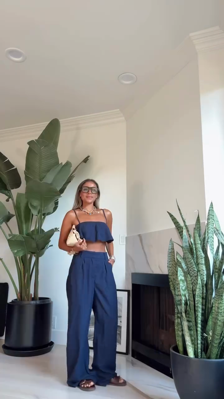 Navy Blue Ruffled Crop Top and Wide - Leg Pants Set
