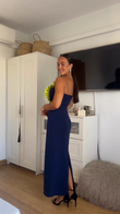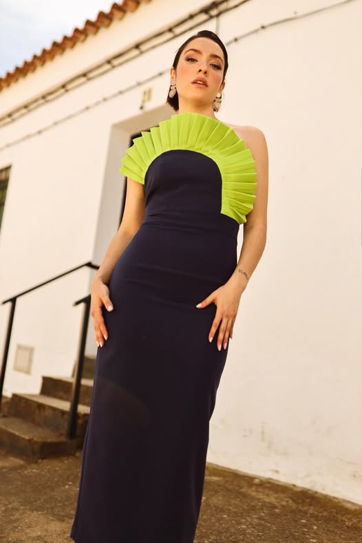 Navy Blue Strapless Maxi Dress with Yellow Fan - shaped Detail