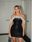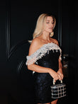 This captivating off-the-shoulder black mini dress, shimmering with a shimmering texture, is incredibly captivating in the light. The gorgeous off-the-shoulder neckline, embellished with delicate beading and fringe detailing, adds a touch of luxurious elegance. Paired with a petite crystal-encrusted handbag and stylish black heels, this dress is perfect for special occasions like parties and formal events, where its sophisticated, dazzling design is sure to make you stand out.