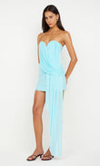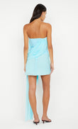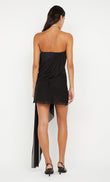 This mini dress features an off-the-shoulder design and a sweetheart neckline, creating a feminine and alluring look. The draped fabric adds a touch of sophistication, while the asymmetrical hem accentuates the modern silhouette.