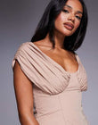 This elegant off-the-shoulder midi dress features a soft beige hue. The bodice is detailed with ruched, off-the-shoulder detailing, flattering the neck and shoulders. The skirt is detailed with delicate pleats, creating an elegant silhouette at the flowing train. Perfect for formal occasions or special events, paired with strappy sandals, this dress exudes refined elegance and timeless charm.