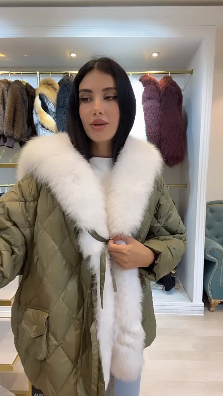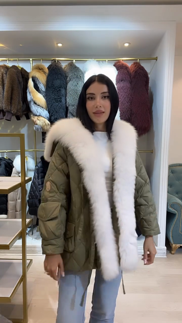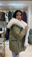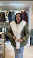 Olive Green Puffer Jacket with White Faux Fur Trim