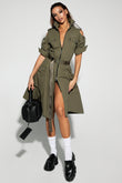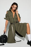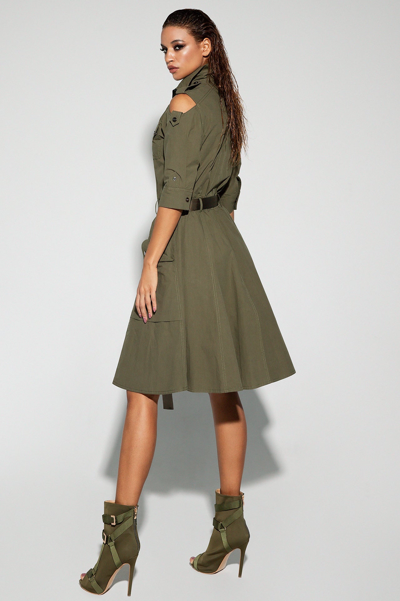 Olive Green Utility - Style Dress with Cut - Out Shoulders It featuring cut - out shoulders, 3/4 sleeves, and multiple pockets. It's cinched at the waist with a belt that has a long, branded strap hanging down. The outfit is completed with matching olive green strappy sandals. This dress combines functional design with a fashion - forward edge, suitable for a stylish yet practical look in various settings.