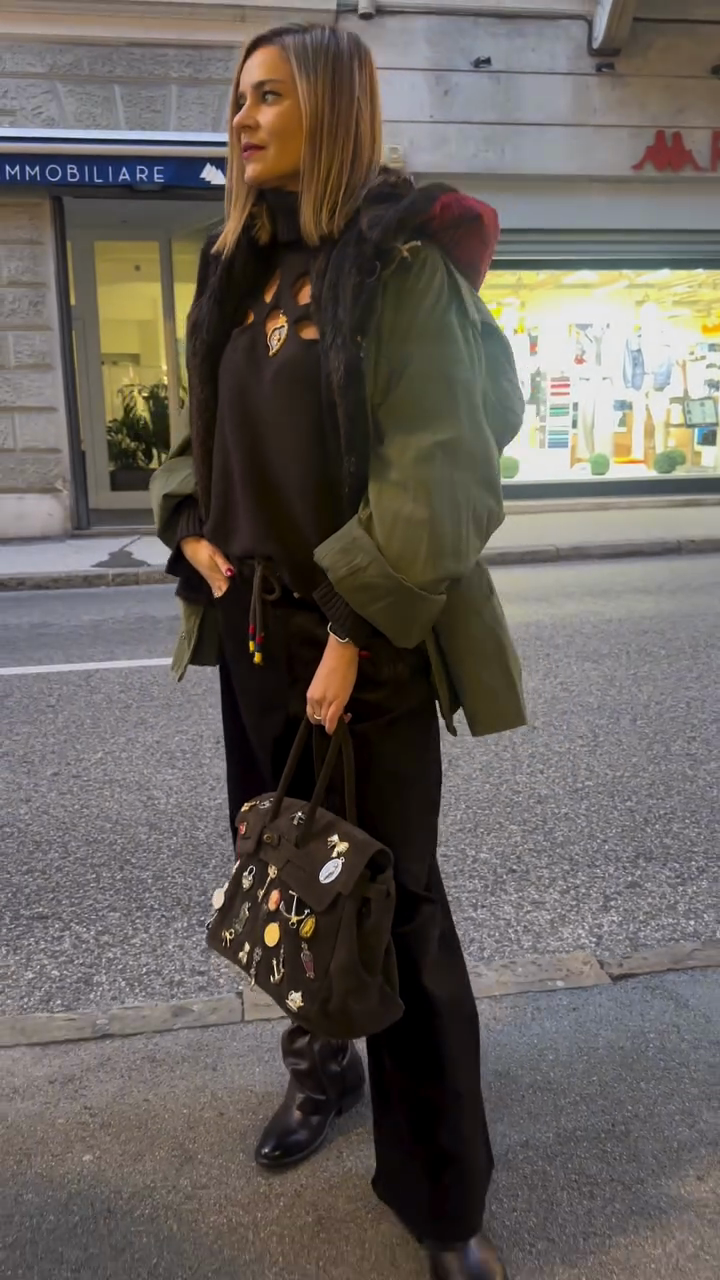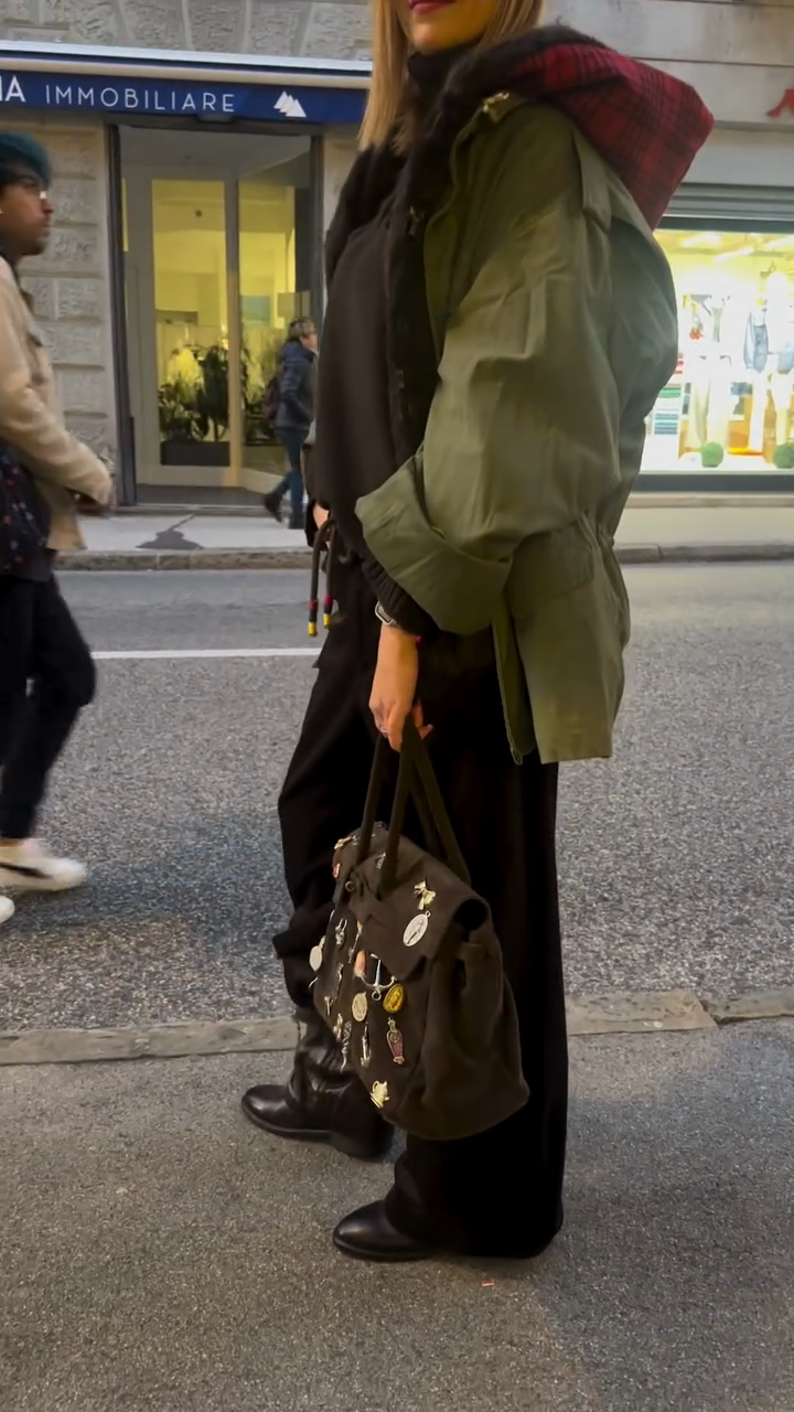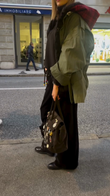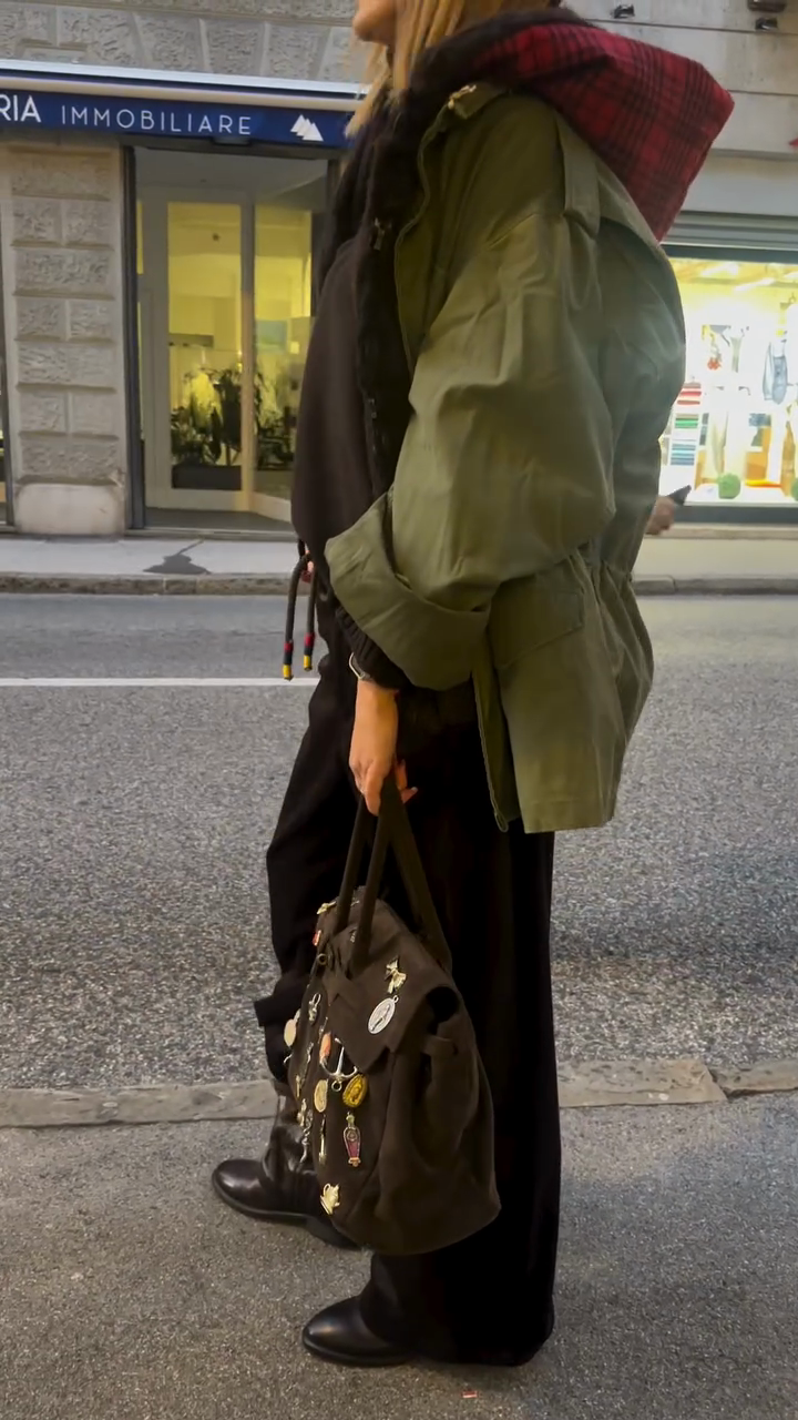 This olive green workwear jacket is made from a cotton blend and features a detachable plaid hood and drawstring belt. Pair it with black wide-leg pants and an eye-catching bag for an effortlessly casual streetwear look.