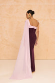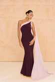 This gown features a striking one-shoulder design with flowing pink draped panels, adding a touch of drama and movement. The deep burgundy color exudes sophistication, while the mermaid silhouette accentuates the figure, creating an elegant and captivating look.