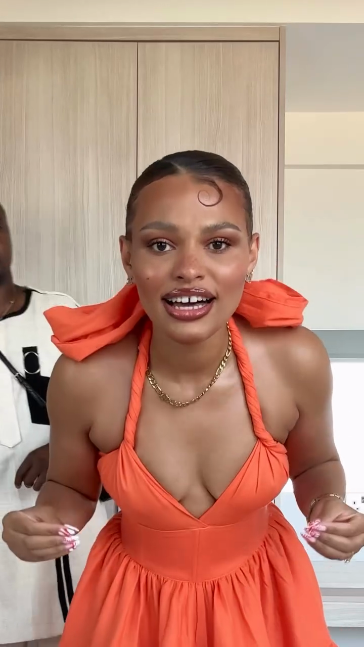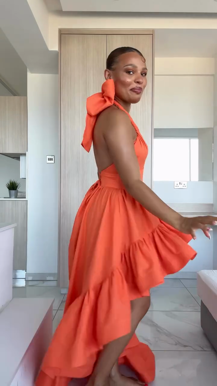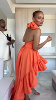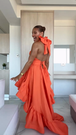 Orange Halterneck High - Low Dress with Bow Detail features a deep V - neckline and a large bow at the back of the neck. It has a high - low hem design, with the front being shorter and the back cascading down in ruffled layers. This dress is suitable for special occasions like parties, weddings, or formal events, exuding a playful yet elegant vibe.