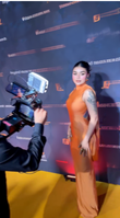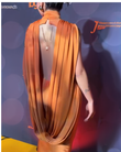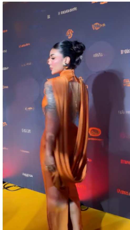Orange High - Neck Sleeveless Gown has a form - fitting silhouette and features a unique, draped detail at the back. The individual has tattoos on their arms and is accessorized with large, eye - catching earrings. This outfit is suitable for red - carpet events, formal galas, or high - profile parties, exuding elegance and sophistication.