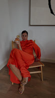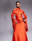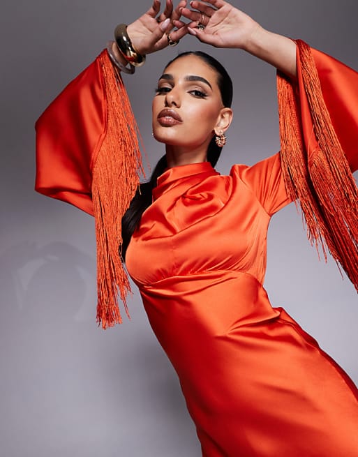 This orange maxi dress is crafted from luxurious satin for a dazzling and elegant look. The most striking feature is the long fringe detailing on the sleeves, adding movement and grace to your movements. The slim fit hugs the body, flattering your curves. The high neckline and long sleeves complement the sensual silhouette, making it an ideal choice for formal occasions like galas, award ceremonies, or upscale dinners. As shown, pair it with simple lace-up heels for an eye-catching look. Accessorize with minimal jewelry to enhance the dress's bold color and design.
