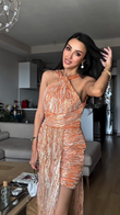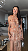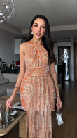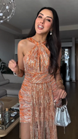 Orange Sequined Halter Mini Dress with Fringe Detail